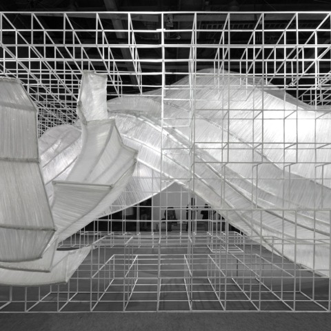 Se elige la película transparente para conectar la interfaz de la carcasa. Se teje como la seda, firme pero también adoptando una forma orgánica y casual. Penetrada por la luz, la textura produce un efecto flexible y cambiante de luz y sombra, construyendo así un mundo translúcido, débil, variable en la intensidad, estable pero incierto. El cuerpo principal de la estructura se compone de marcos de metal y un gran número de aceros curvos irregulares. Cada uno de los 30 marcos arqueados varía en su ritmo ondulante, irregular y poli-direccional. Es un gran desafío en cuanto a cómo capturar con precisión la localización y restaurar completamente la forma global. Pasamos por un montón de experimentos y, finalmente, llegó con el método más simple y más eficaz. Las curvas en la hélice fueron seleccionadas para un radio preciso en cada segmento, obteniendo así los nodos precisos. La coordinación 3-D de cada nodo se situó en el espacio, sobre la base en la cual se hizo otra curva con tubos de acero. Luego, se unieron en grupos para su interconexión. Finalmente, surgió un prototipo de esqueleto tipo hélice, dinámica y libremente entrecruzada.