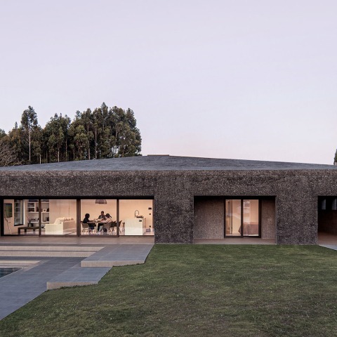La casa es un objeto macizo y contundente, casi monumental. La intención es crear una clara sensación de protección a los habitantes con un material que mira al exterior y contrasta con la calidez del interior. La materialidad de los muros continúa por toda la cubierta creando una forma casi arcaica cuya textura se va suavizando a través de los huecos que creamos en el hormigón con una tonalidad casi textil pero que, al igual que el exterior, muestra su composición como lo haría cada dovela de un arco. El hormigón negro tiene áridos oscuros con tonalidades verdes y blancas que intentan generar una relación con el entorno natural además de darle escala al conjunto.