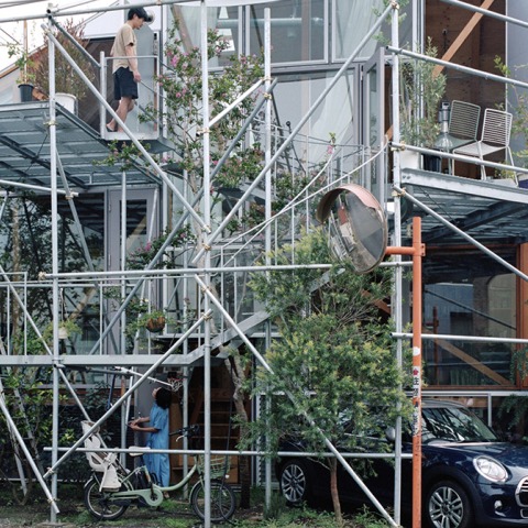 Los materiales estructurales están expuestos de modo que las juntas y las piezas unidas se puedan ver desde un lado. No hay muro entre la casa y su jardín, sino un compuesto de ventanas y carpintería ensambladas. Además de los elementos estructurales como vigas cuadradas, elementos de acero, pilares y vigas de tubos simples y tirantes, hay escaleras, balaustradas, marcos de ventanas, muebles, cortinas, ropa y otros artículos diversos, árboles, macetas, bicicletas, una regadera, palas y una gran cantidad de libros, videocintas, DVD, etc. del trabajo de producción de video del residente, todos ellos esparcidos alrededor para dar forma a variadas escenas de la vida. Capas de líneas se entrelazan desde el exterior al interior del edificio para que cada habitante pueda vivir libremente y encontrar su entorno relajante.