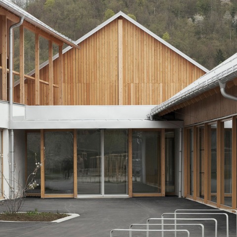 El nuevo edificio de 2300 m² amplía el borde existente de Bohinjska Bistrica, teniendo en cuenta las características geométricas y orientación de la parcela, su entorno y la escala del territorio. Enfatiza la horizontalidad mediante la implantación de tres grandes cubiertas inclinadas, resultado de fragmentar el programa en tres volúmenes lineales distintos. Como consecuencia de ello, se definen y delimitan simultáneamente los espacios exteriores: por un lado, una plaza interior abierta que funciona como entrada principal y por otro, tres áreas de juego ajardinadas conectadas entre sí y alejadas de los accesos rodados.