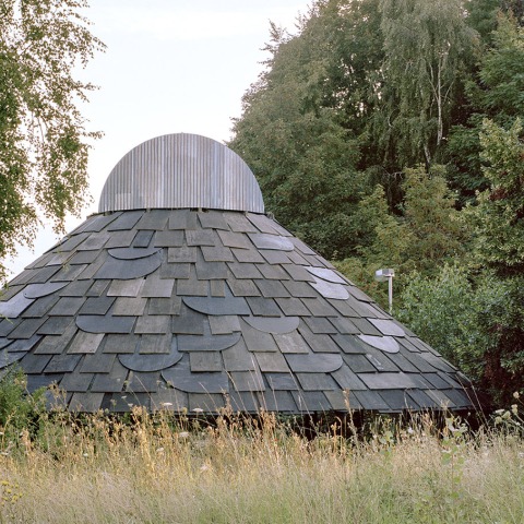 El disco giratorio en la parte superior de la cabaña se abre a la luna, enviando misteriosas señales de humo a las chimeneas hiperboloides vecinas. Para construir este refugio, se desmontó, catalogó y reconstruyó el Feathers Stage, reconocible tectónicamente, de Fala Atelier (2019). Cada elemento de la pista de baile anterior asume una nueva función y se convierte en parte de una transformación primigenia.
