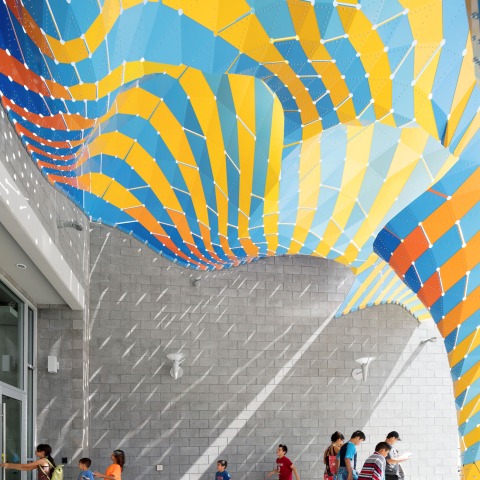 Marquise es una estructura de entrada espacial para Westside Natatorium de El Paso. Un icono visual y un umbral arquitectónico, la estructura ligera de aluminio transforma el enfoque y la experiencia de este nuevo edificio público. Los paneles curvilíneos reticulares comprenden el dosel de colores brillantes y también su sistema estructural autoportante. Un degradado de Cheshire de dos vías en azules profundos y amarillos cálidos se alternan gráficamente para enfatizar las superficies de barrido. Aparentemente inflada por el viento, como una tienda de campaña o una vela, la superficie ultradelgada se eleva desde el suelo, donde forma dos asientos contiguos: elementos de hormigón colocados en el lugar que heredan la curvatura compuesta de la superficie facetada pero que fluye.