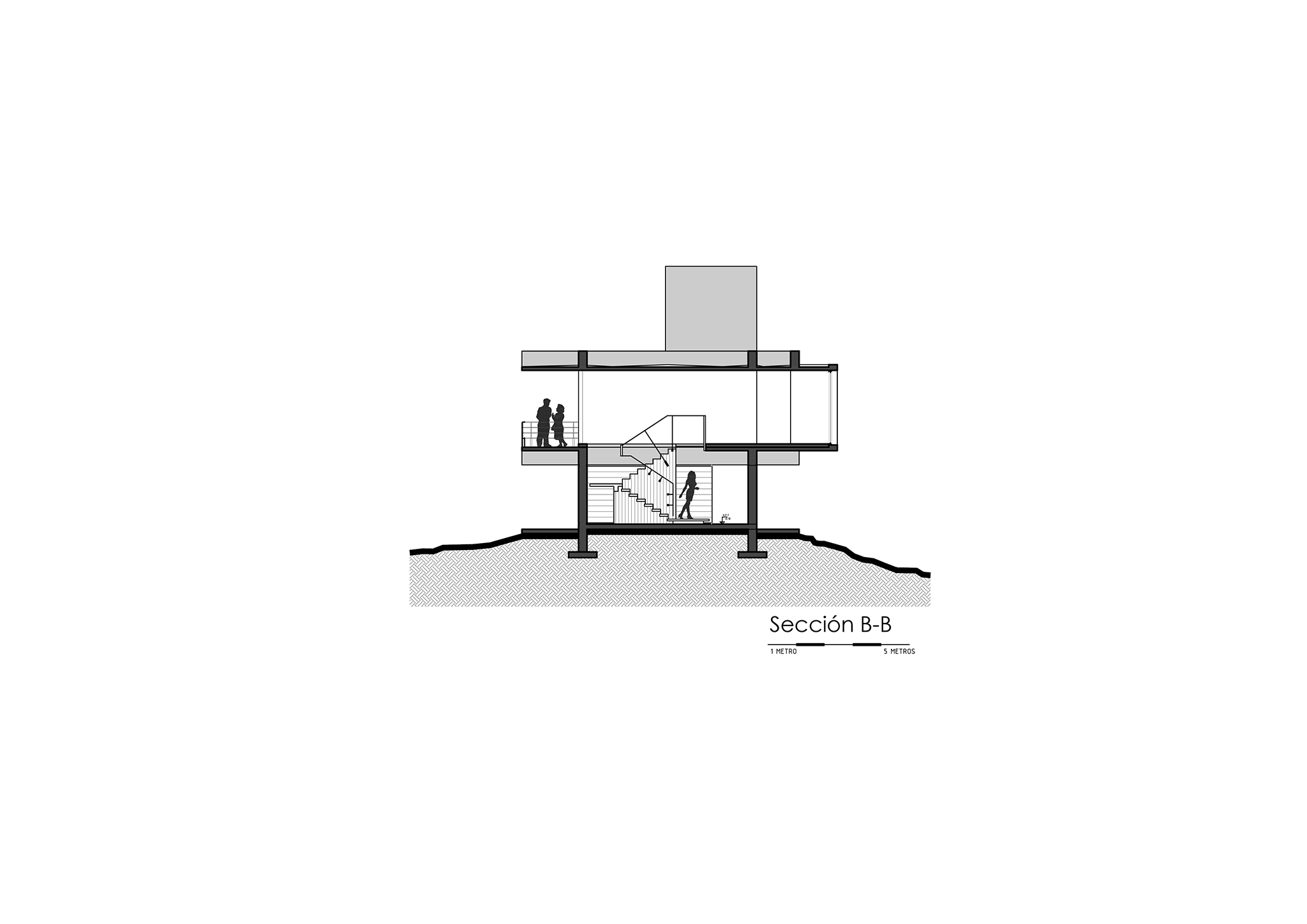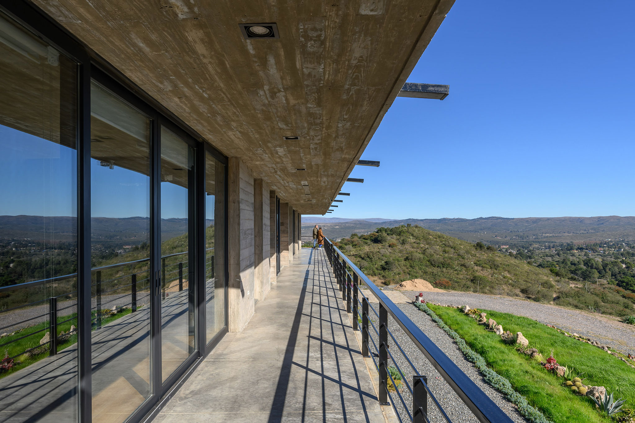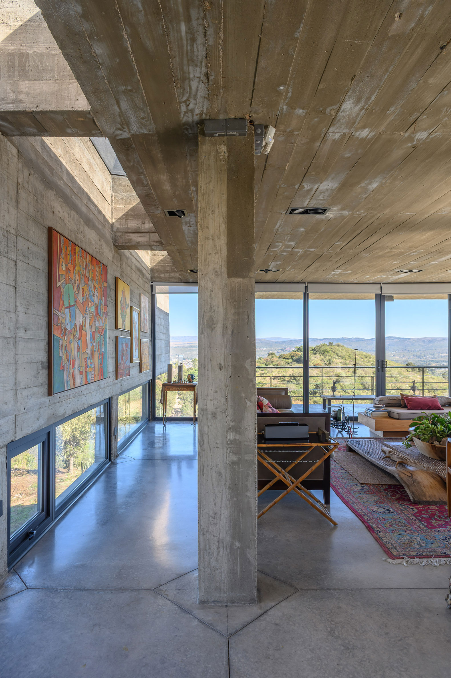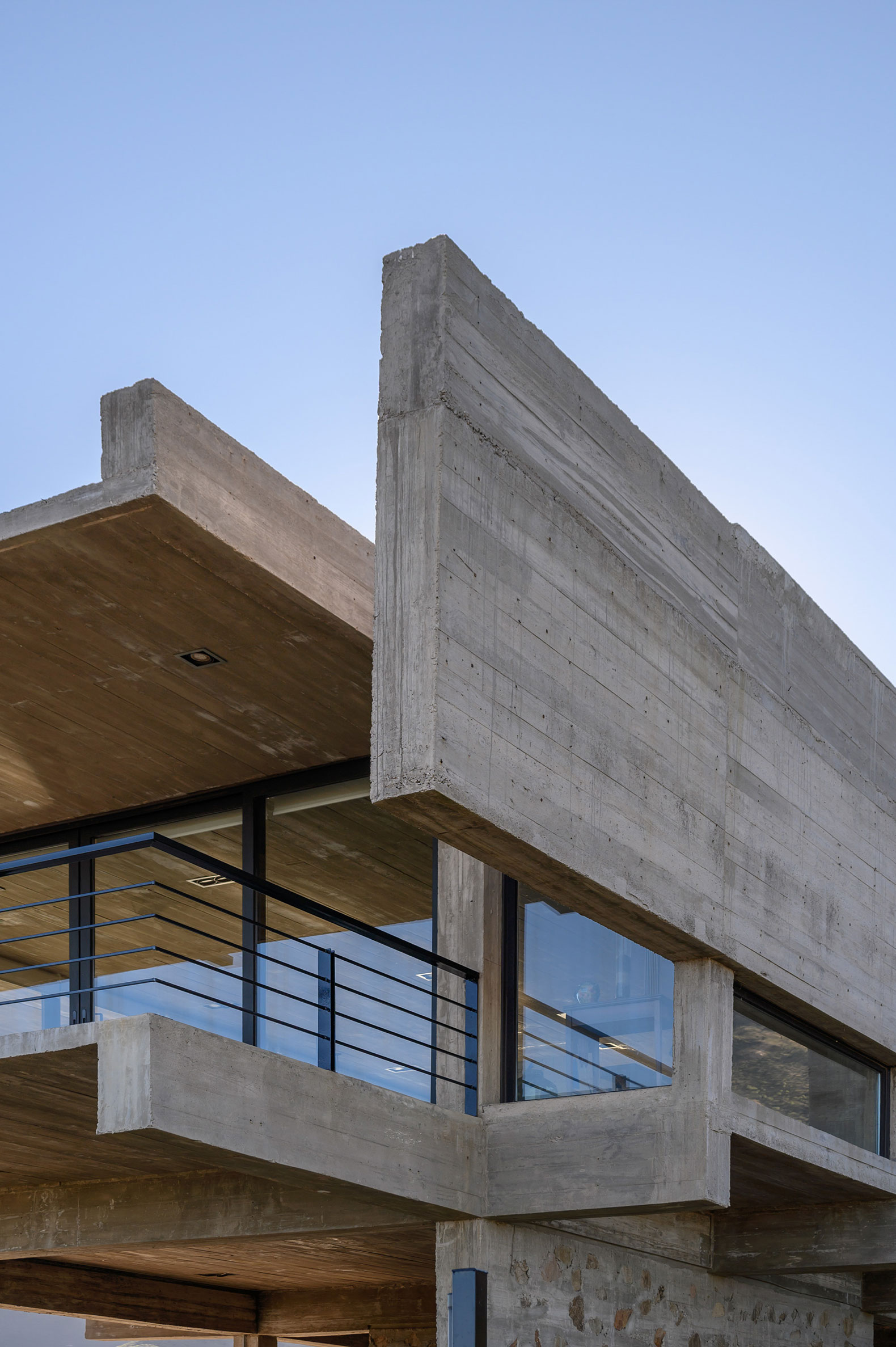 La casa expone deliberadamente su mecanismo estructural: aquí, la estructura es la arquitectura. El basamento pétreo conformado por los muros ciclópeos, alineado a la geometría modular que organiza todo el proyecto, sostiene el volumen superior que se proyecta hacia el perímetro, conformando galerías en todos sus frentes, salvo al sur. En este último, también en voladizo, se dispone la circulación longitudinal interior, protegida por un tabique suspendido entre pórticos que se interrumpe únicamente en tres grandes cajas de hormigón, enmarcando visuales específicas. Esta circulación recibe iluminación cenital, lo que permite que la luz solar directa cualifique los espacios interiores adyacentes al tabique sur.