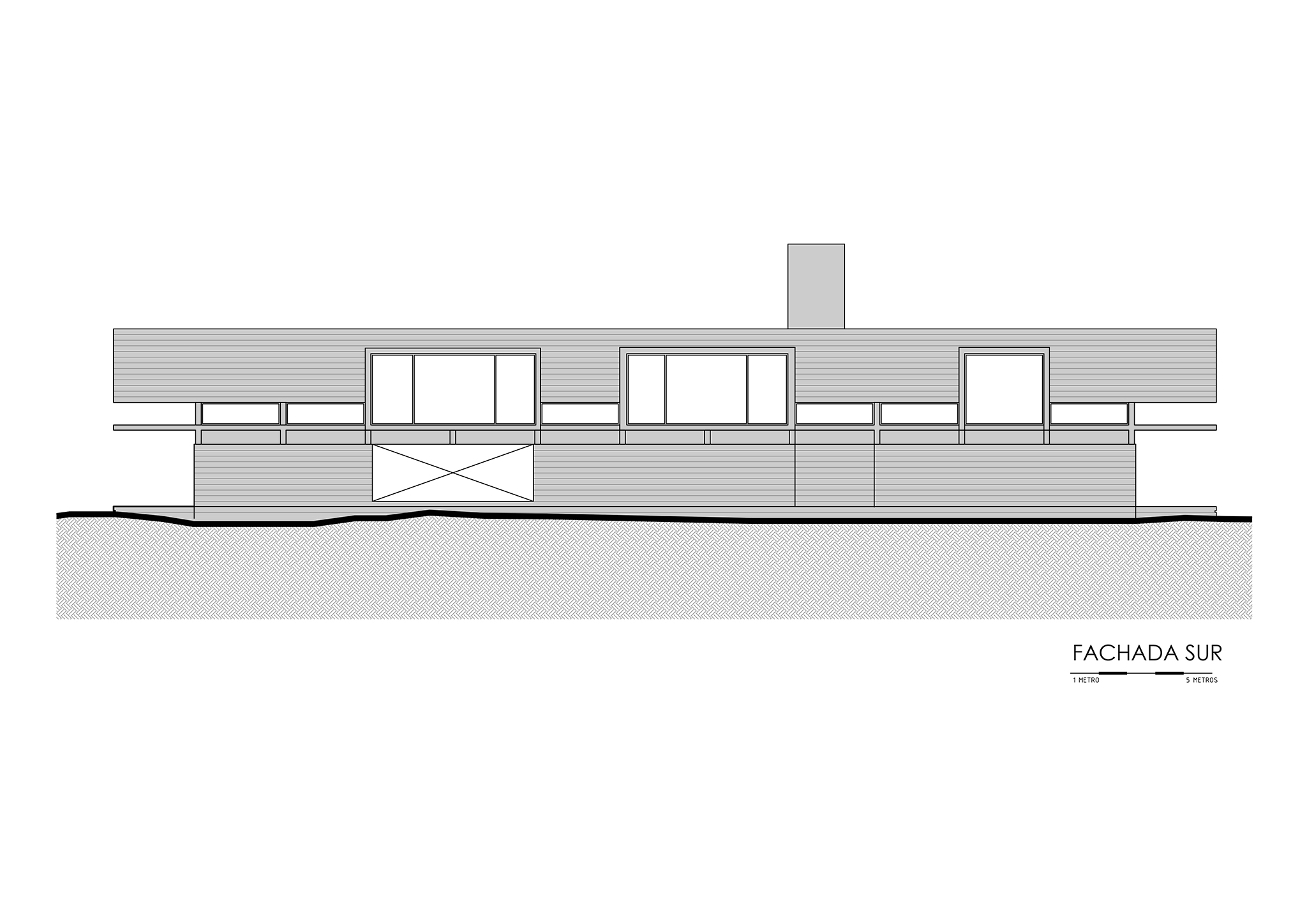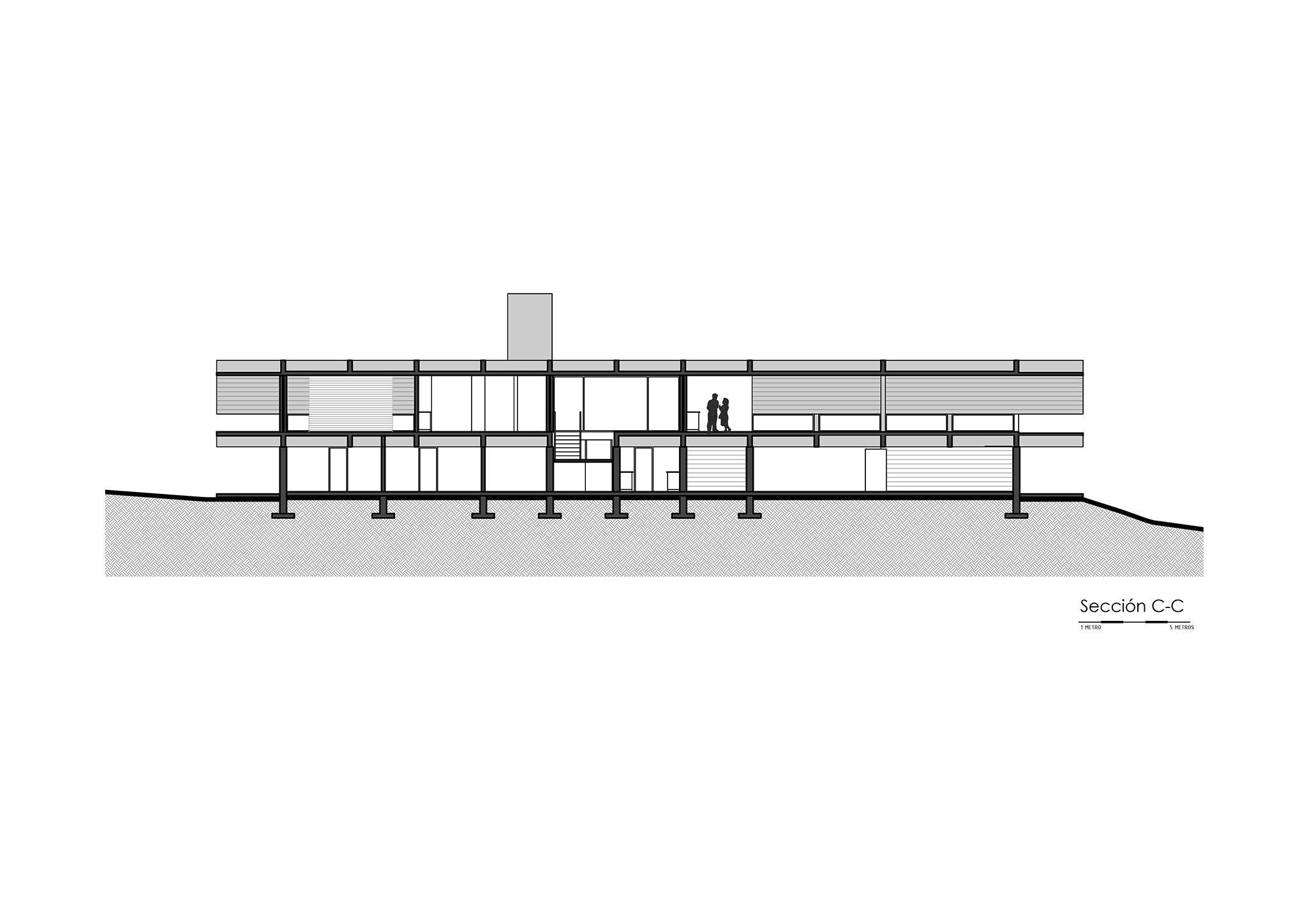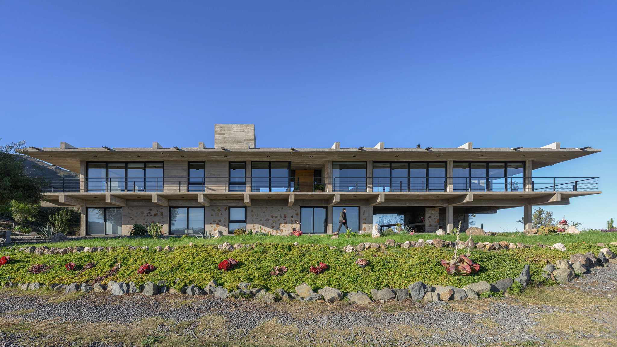 La casa expone deliberadamente su mecanismo estructural: aquí, la estructura es la arquitectura. El basamento pétreo conformado por los muros ciclópeos, alineado a la geometría modular que organiza todo el proyecto, sostiene el volumen superior que se proyecta hacia el perímetro, conformando galerías en todos sus frentes, salvo al sur. En este último, también en voladizo, se dispone la circulación longitudinal interior, protegida por un tabique suspendido entre pórticos que se interrumpe únicamente en tres grandes cajas de hormigón, enmarcando visuales específicas. Esta circulación recibe iluminación cenital, lo que permite que la luz solar directa cualifique los espacios interiores adyacentes al tabique sur.