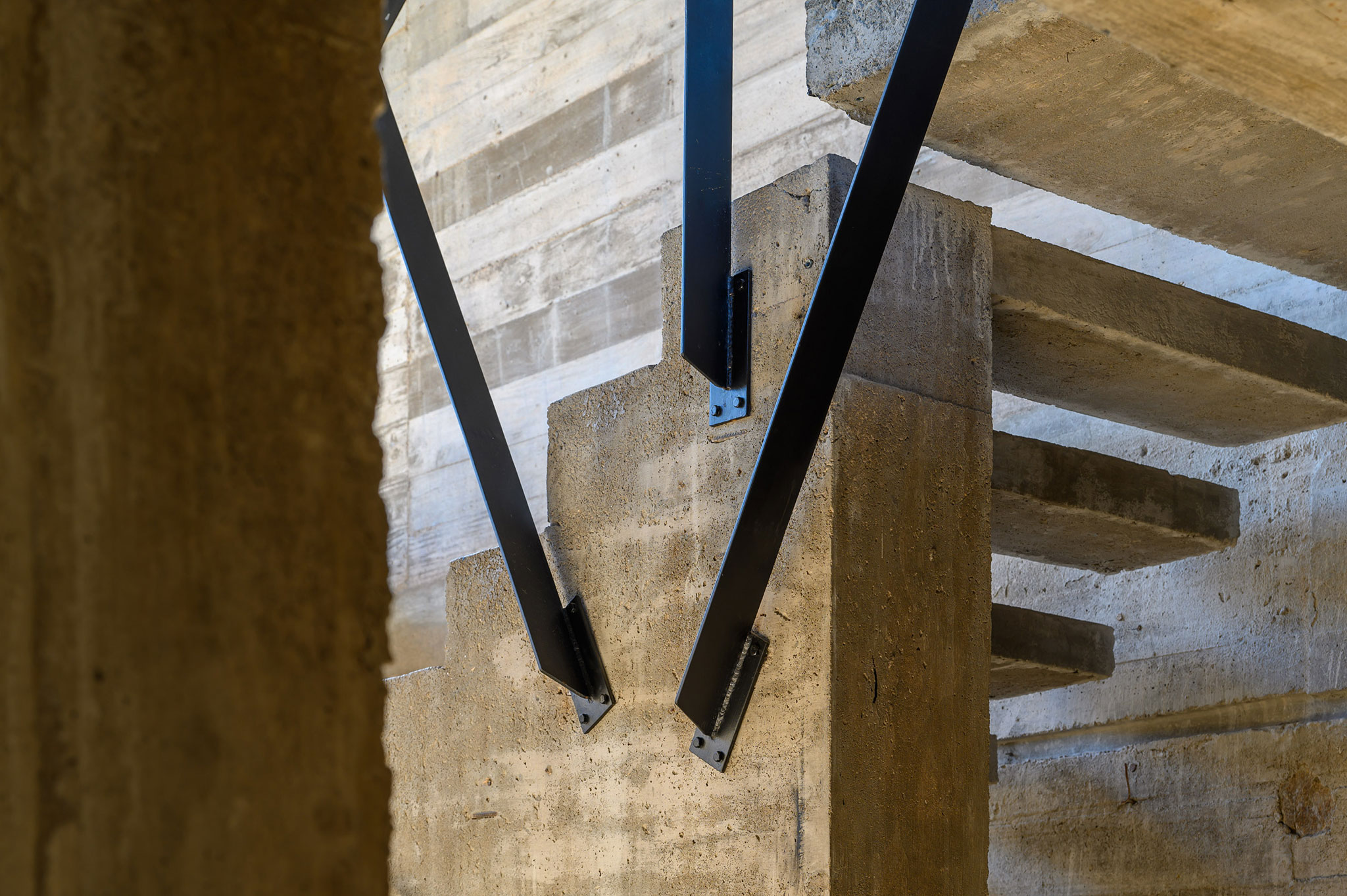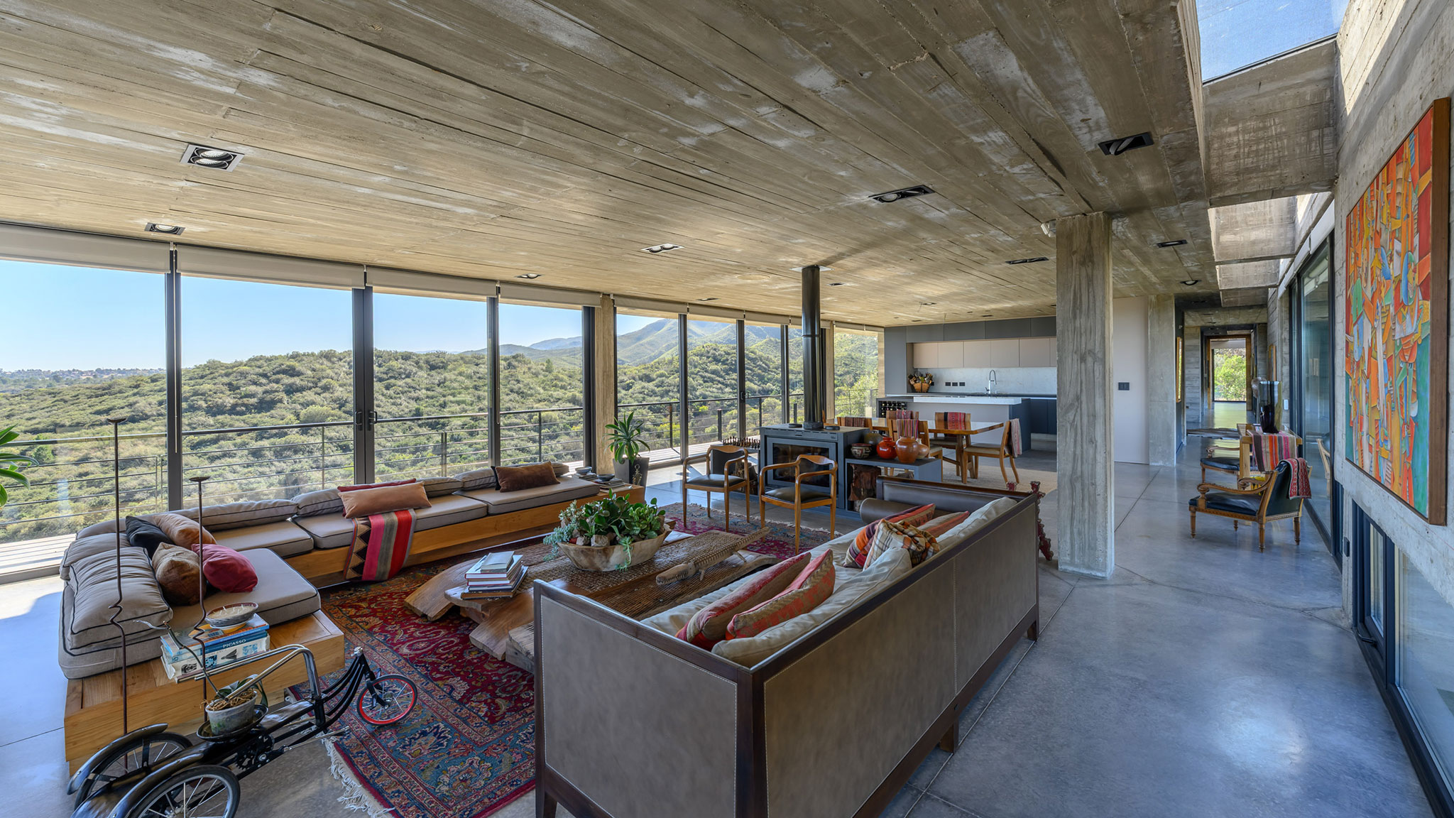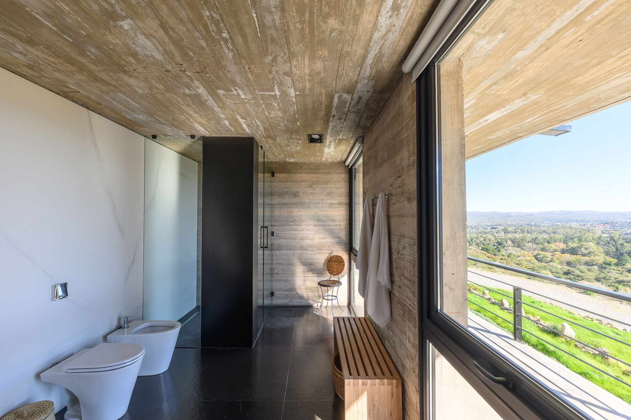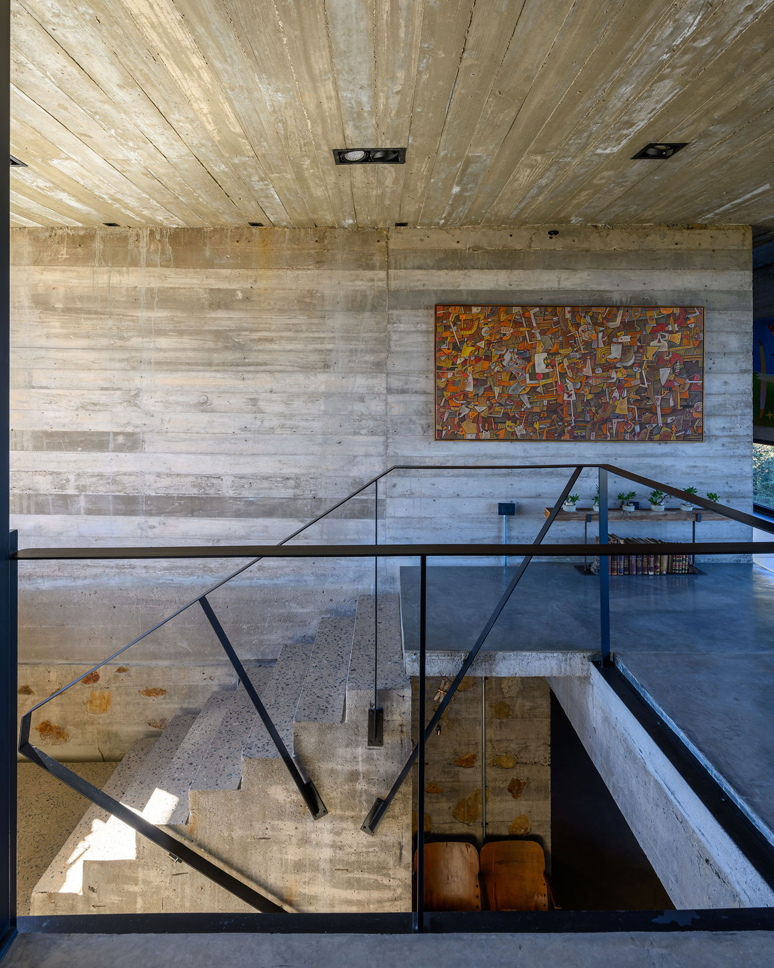 La casa expone deliberadamente su mecanismo estructural: aquí, la estructura es la arquitectura. El basamento pétreo conformado por los muros ciclópeos, alineado a la geometría modular que organiza todo el proyecto, sostiene el volumen superior que se proyecta hacia el perímetro, conformando galerías en todos sus frentes, salvo al sur. En este último, también en voladizo, se dispone la circulación longitudinal interior, protegida por un tabique suspendido entre pórticos que se interrumpe únicamente en tres grandes cajas de hormigón, enmarcando visuales específicas. Esta circulación recibe iluminación cenital, lo que permite que la luz solar directa cualifique los espacios interiores adyacentes al tabique sur.