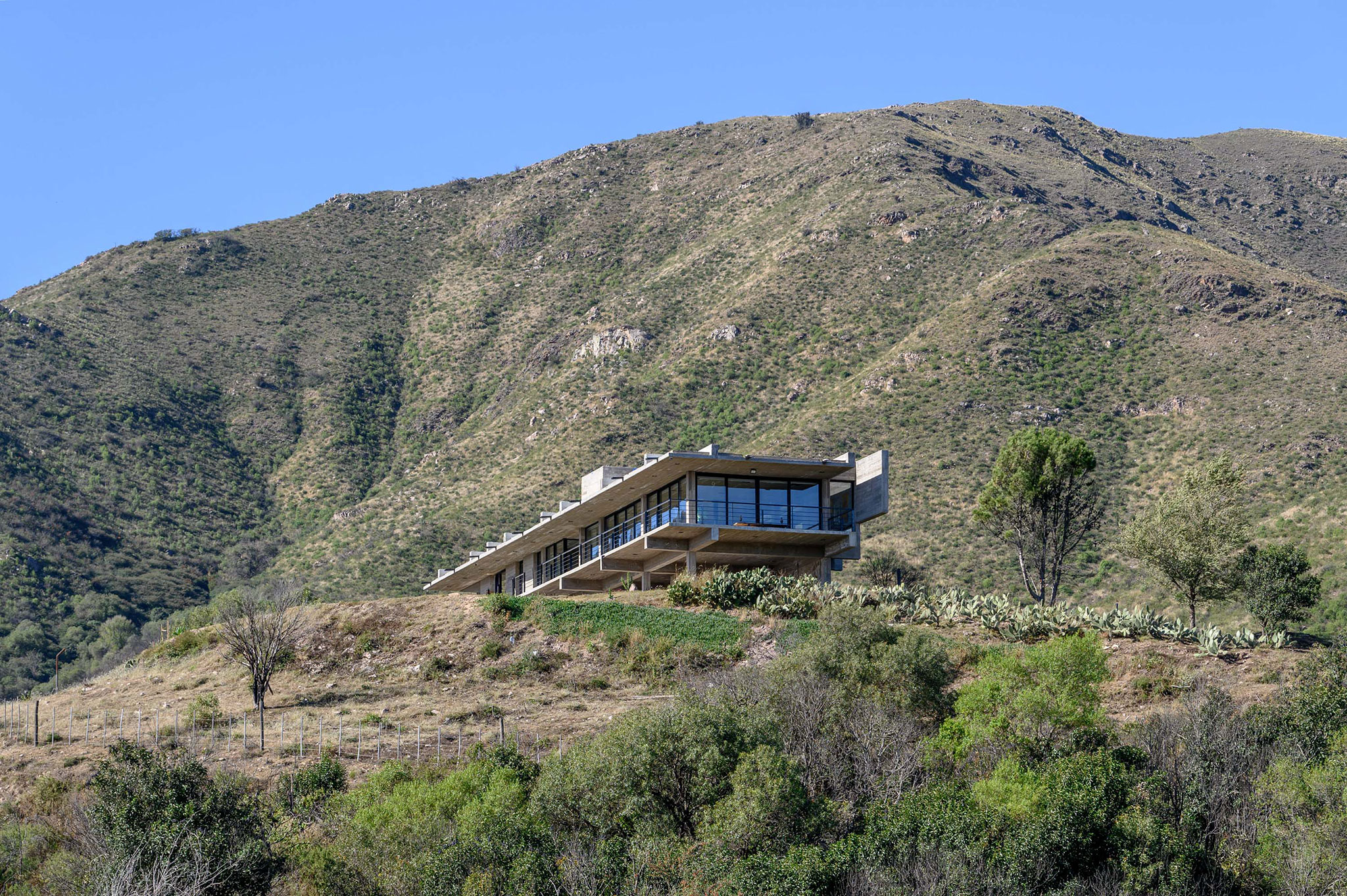 Sobre una meseta elevada, cercana al camino de acceso y en el punto más alto del lote, la casa se desarrolla en dos plantas con una disposición lineal y una apertura franca hacia el noroeste.