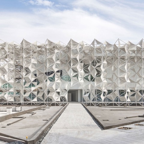 La fachada tridimensional combina patrones Arabesque y Asanoha al mismo tiempo que hace referencia al arte tradicional japonés de Origami. La estructura que envuelve el pabellón también es una referencia al arte japonés del envoltorio de regalo Origata. Como lo describe Nagayama: "en términos de la conexión cultural, tomé mi punto de partida de las similitudes que podemos ver entre los patrones geométricos de Oriente Medio y Japón, y exploré esto a través de una fachada que es un nuevo tipo de celosía geométrica 3D que sirve como el estructura y filtro ambiental".