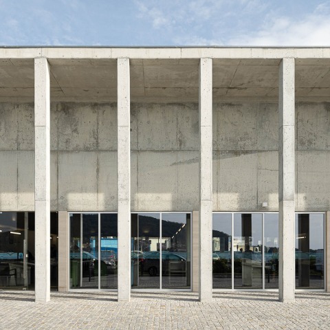 Todo el volumen es de hormigón. Resistente, con carácter de «fuerza», funcional o «frío», se contrasta con el revestimiento de piedra de Molianos, amarilla, noble y «cálida» en la base. Es así, en la escala del hombre y de los materiales, que el proyecto abraza la nobleza y la referencia de un pueblo tan pintoresco como Caminha.