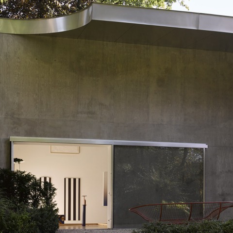 Esta gran sala individual está dedicada a una sola función: disfrutar de una colección privada de arte. Insertada en una pendiente pronunciada de un jardín de una villa en Bruselas, la sala conecta los dos niveles diferentes a cada lado del edificio. En el nivel superior, la puerta corredera se abre a una plataforma de acero y una escalera de caracol que baja desde el nivel de la calle hasta el nivel inferior del jardín. En el otro lado, una gran ventanal da paso a una terraza cubierta con vista al jardín.