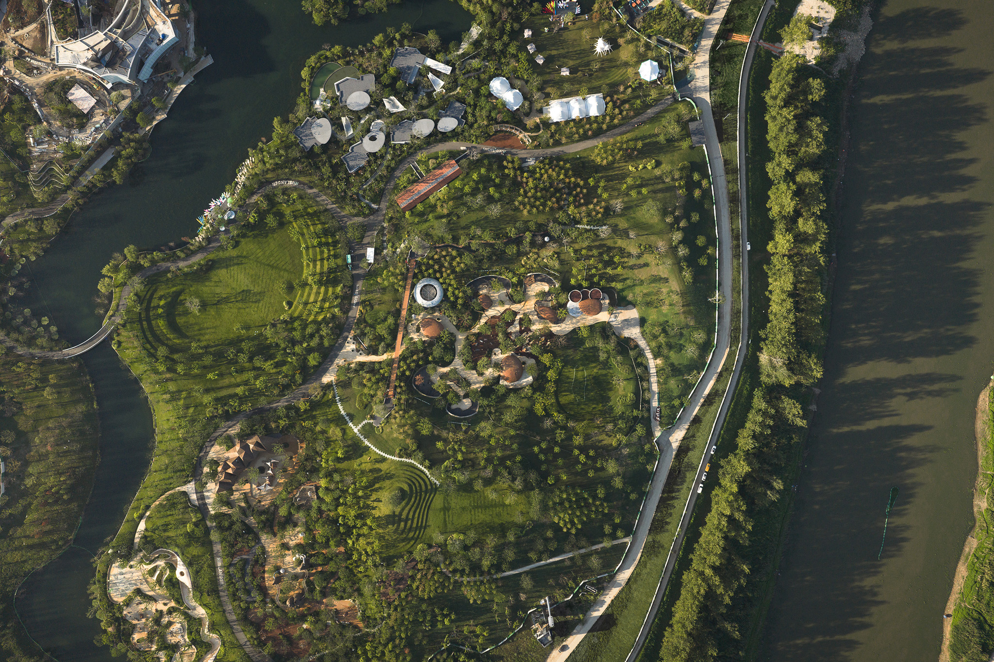 «Los edificios, que parecen meteoritos caídos, se dispersan por todo el valle. Sus techos de bambú parecen brotar naturalmente de las colinas de pasto, proyectando sombras delicadas y cambiantes y entablando un diálogo visual con el terreno natural. Este es el tótem arquitectónico que creamos para LuxeIsland Farm».