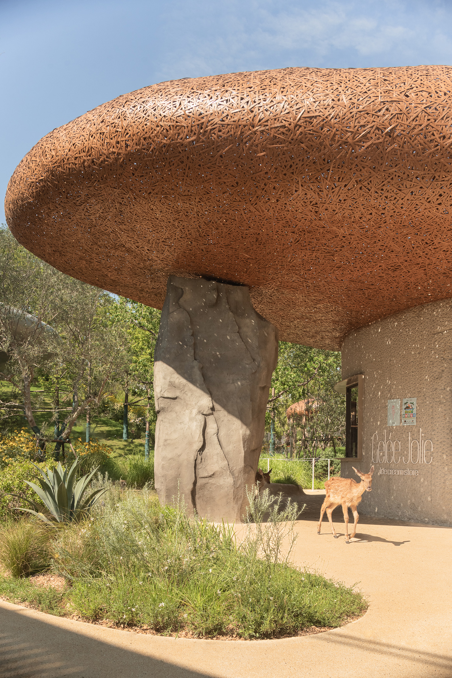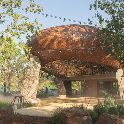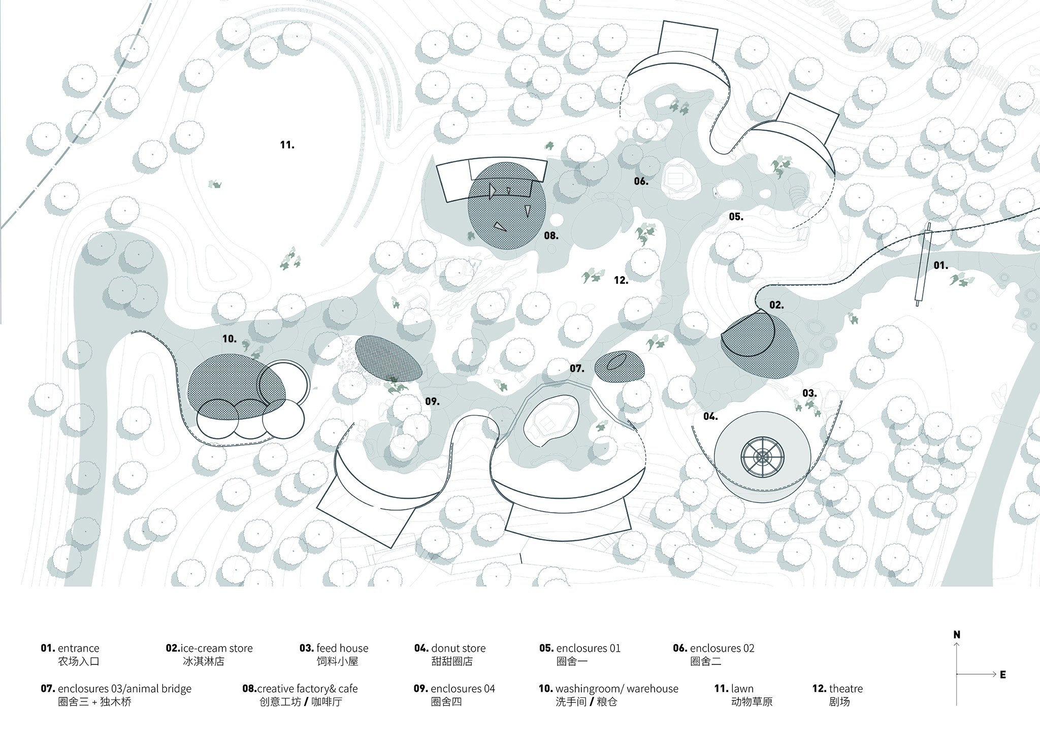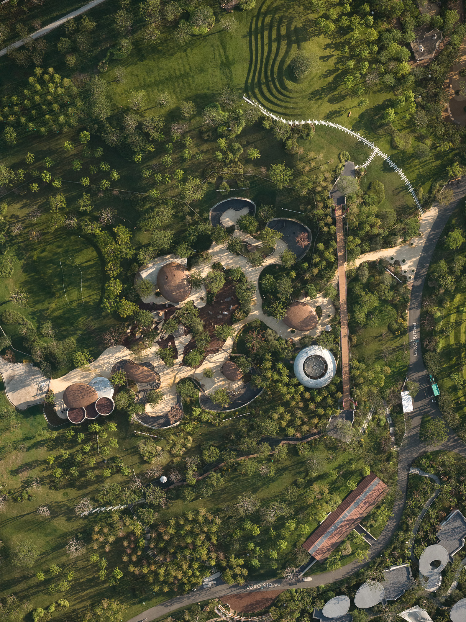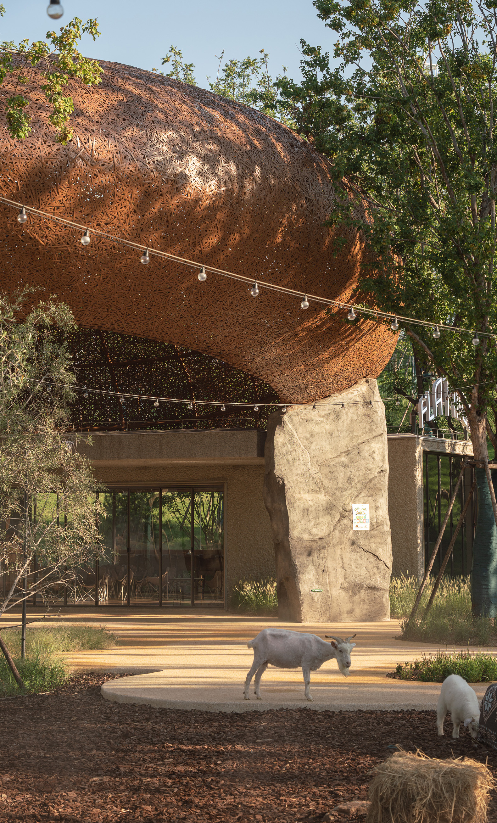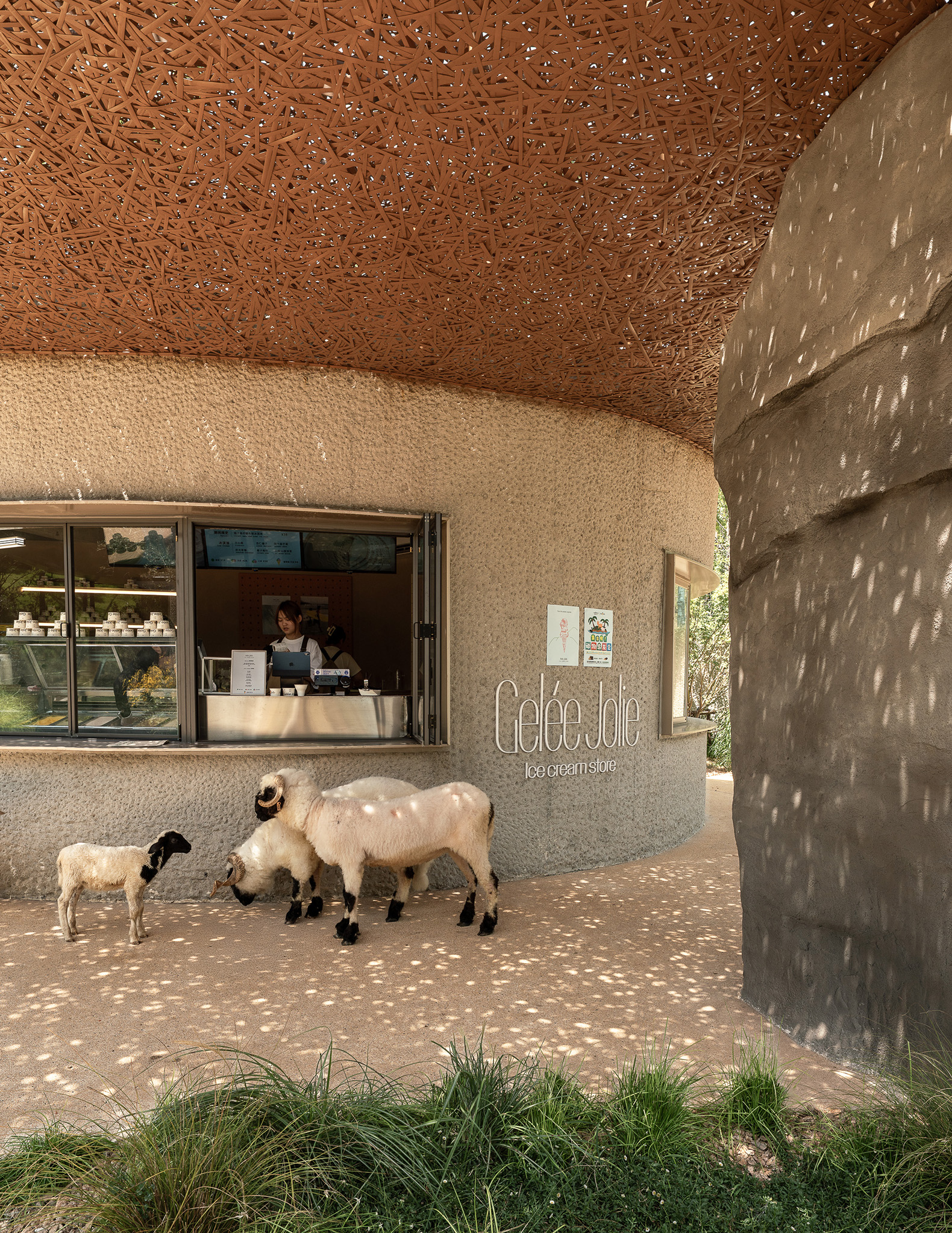 El diseño circular de la granja conecta los recintos de los animales, un taller creativo, tiendas y restaurantes, logrando un equilibrio entre una experiencia inmersiva y la eficiencia operativa. Las nuevas estructuras se integran al paisaje, creando un ritmo visual continuo en todo el sitio. Volúmenes arquitectónicos que evocan rocas emergen delicadamente de los sistemas de nebulización y la vegetación autóctona. Los recintos de animales semisumergidos con techos verdes reducen la masa visual de los edificios, fusionando la granja abierta con la naturaleza.