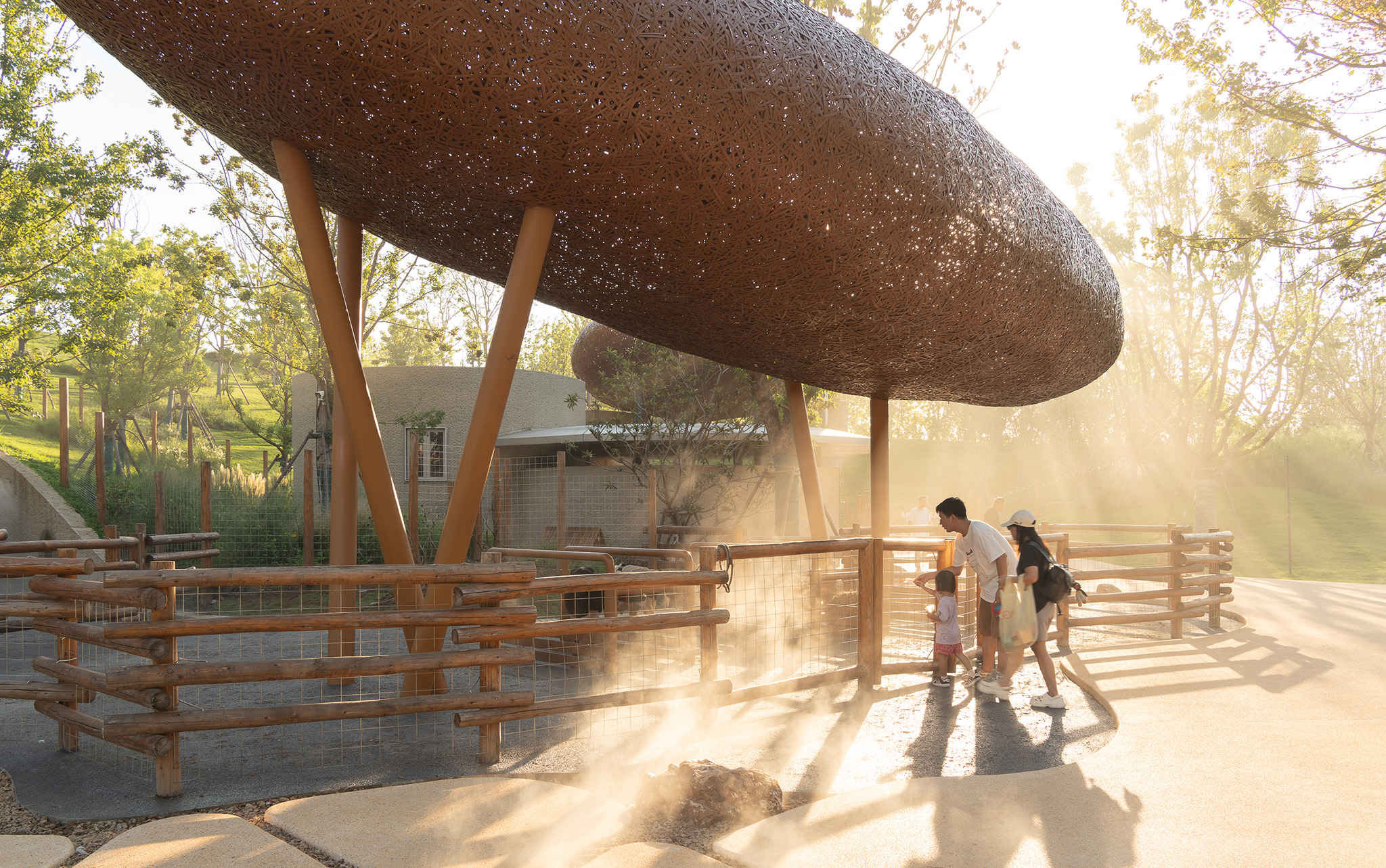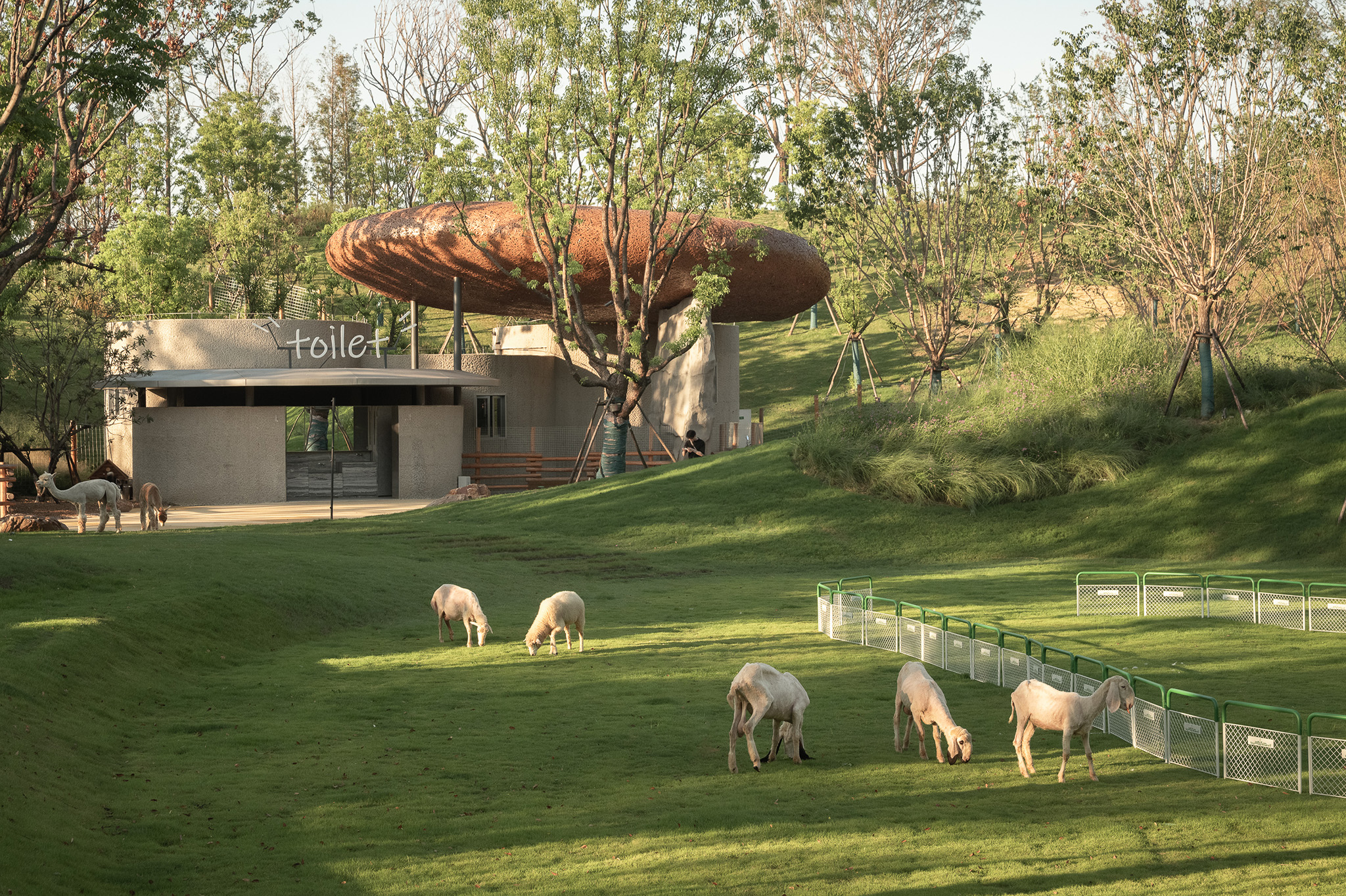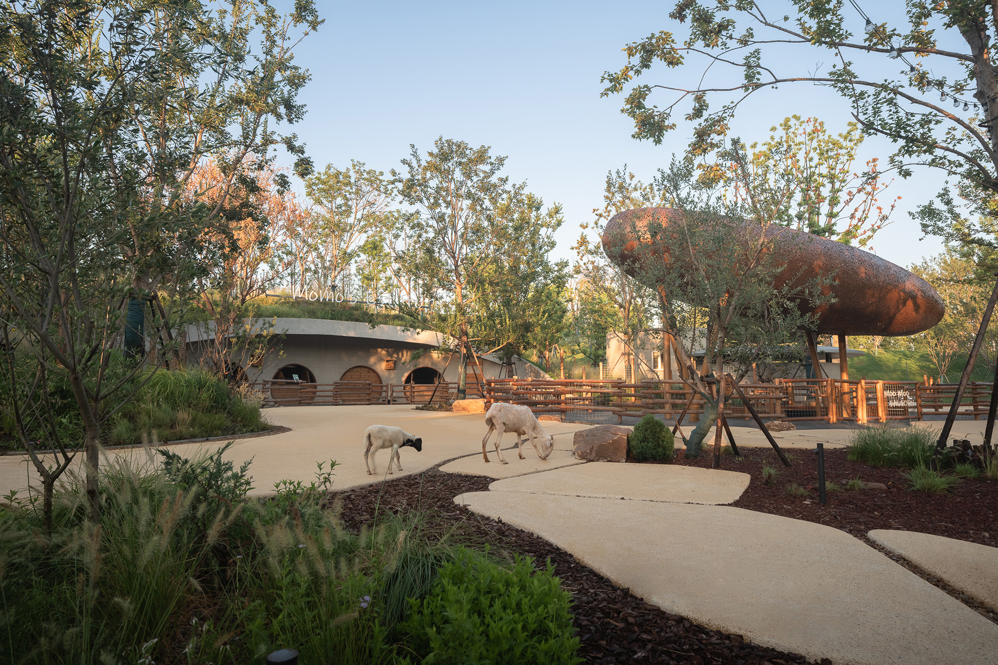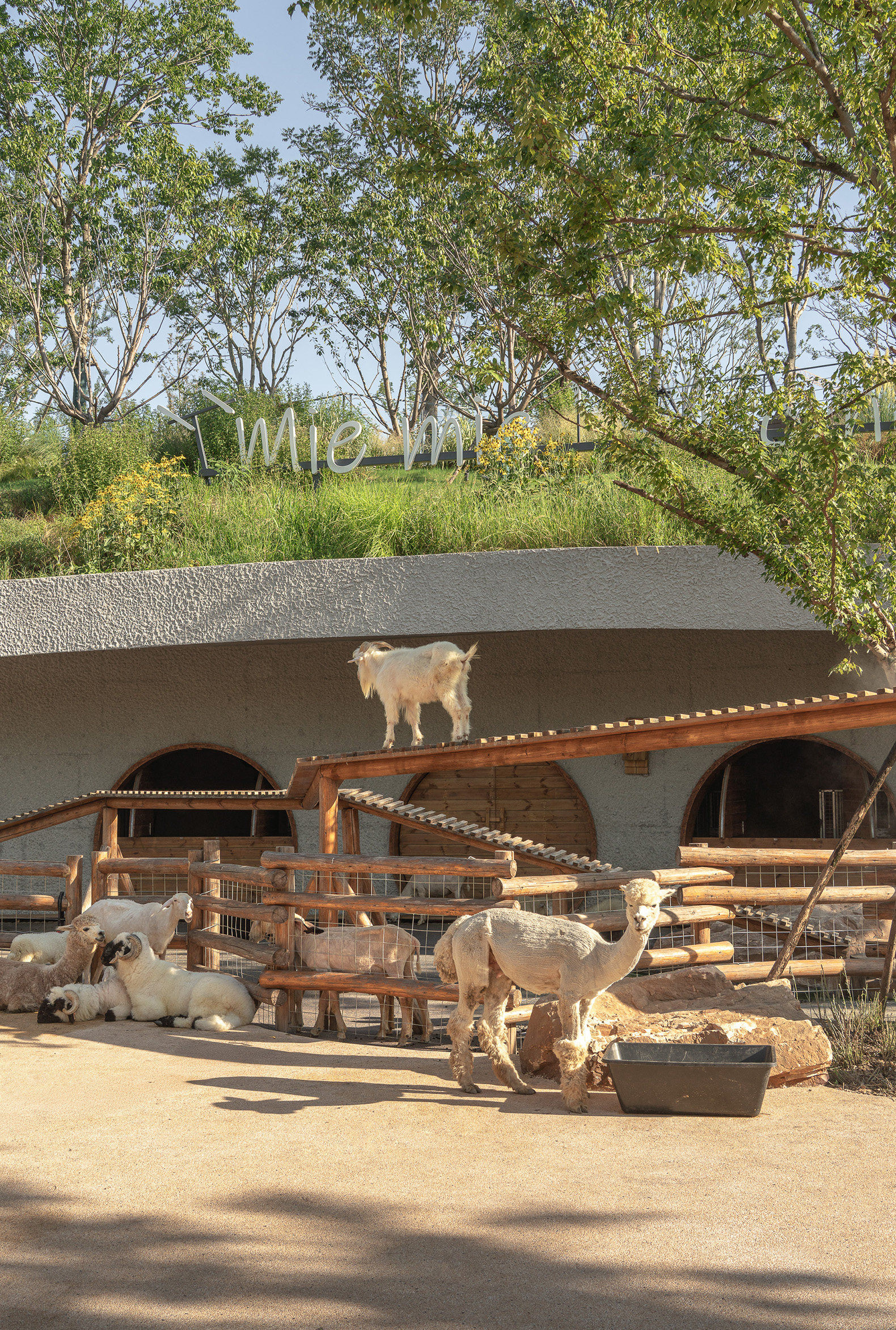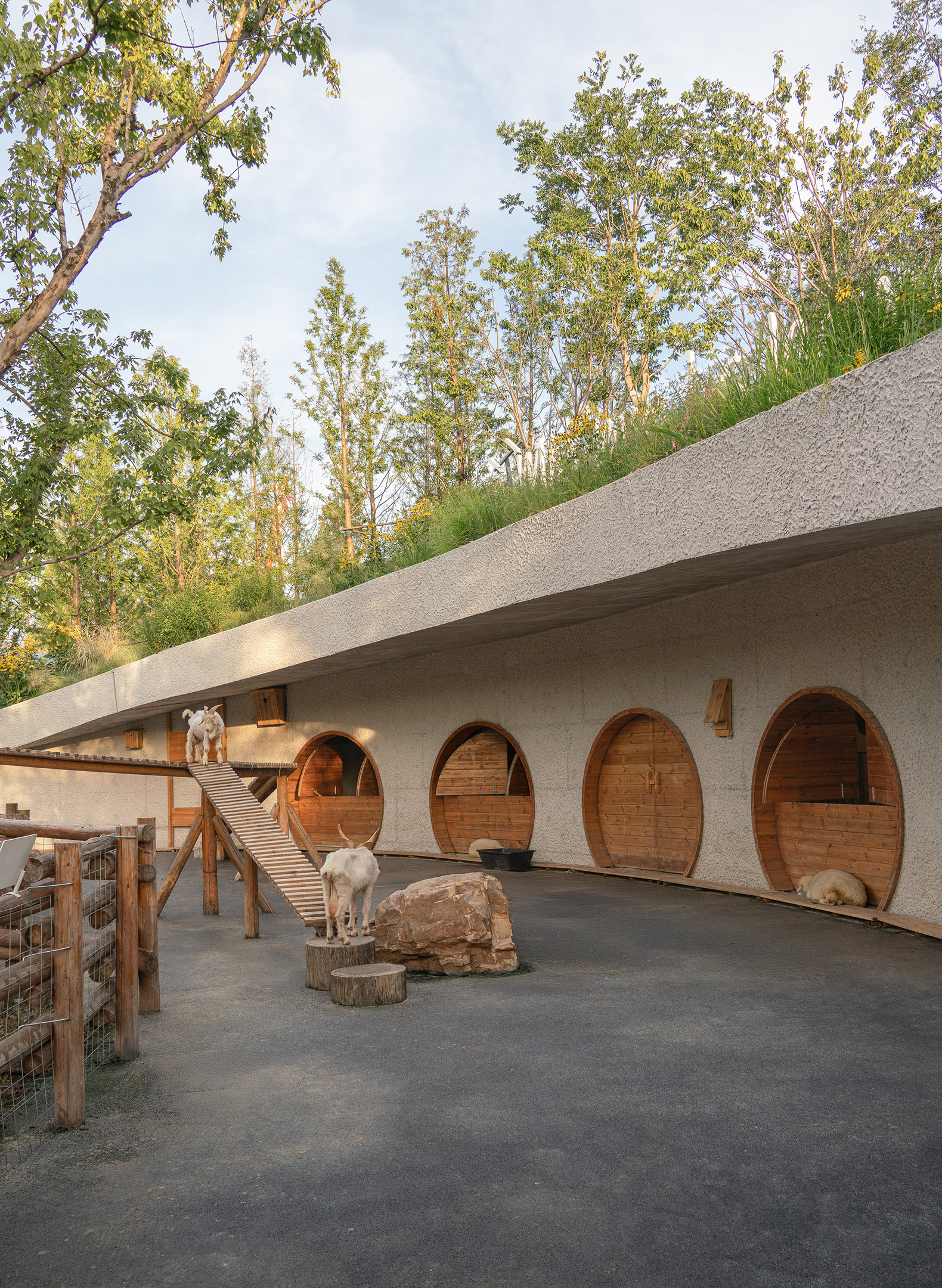La zona de animales combina hábitat, interacción y educación ambiental, con recintos, pabellones de descanso y cafeterías que conforman un conjunto funcional. El diseño de mínima intervención sitúa los recintos bajo las laderas, minimizando su impacto visual. La suave pendiente permite que los animales deambulen por el pasto, mientras que los refugios cubiertos de tierra les brindan seguridad y comodidad.