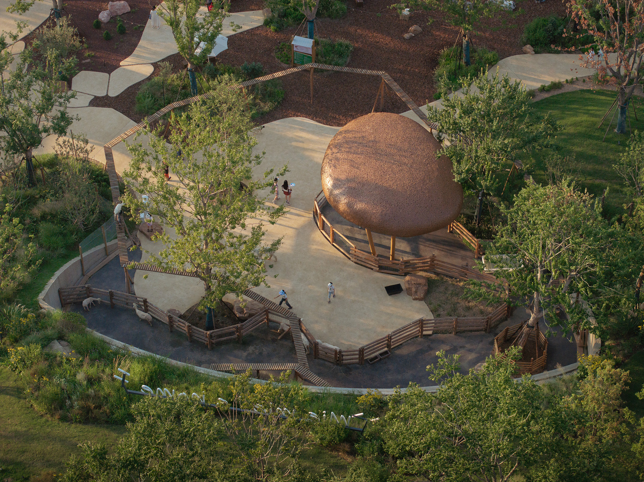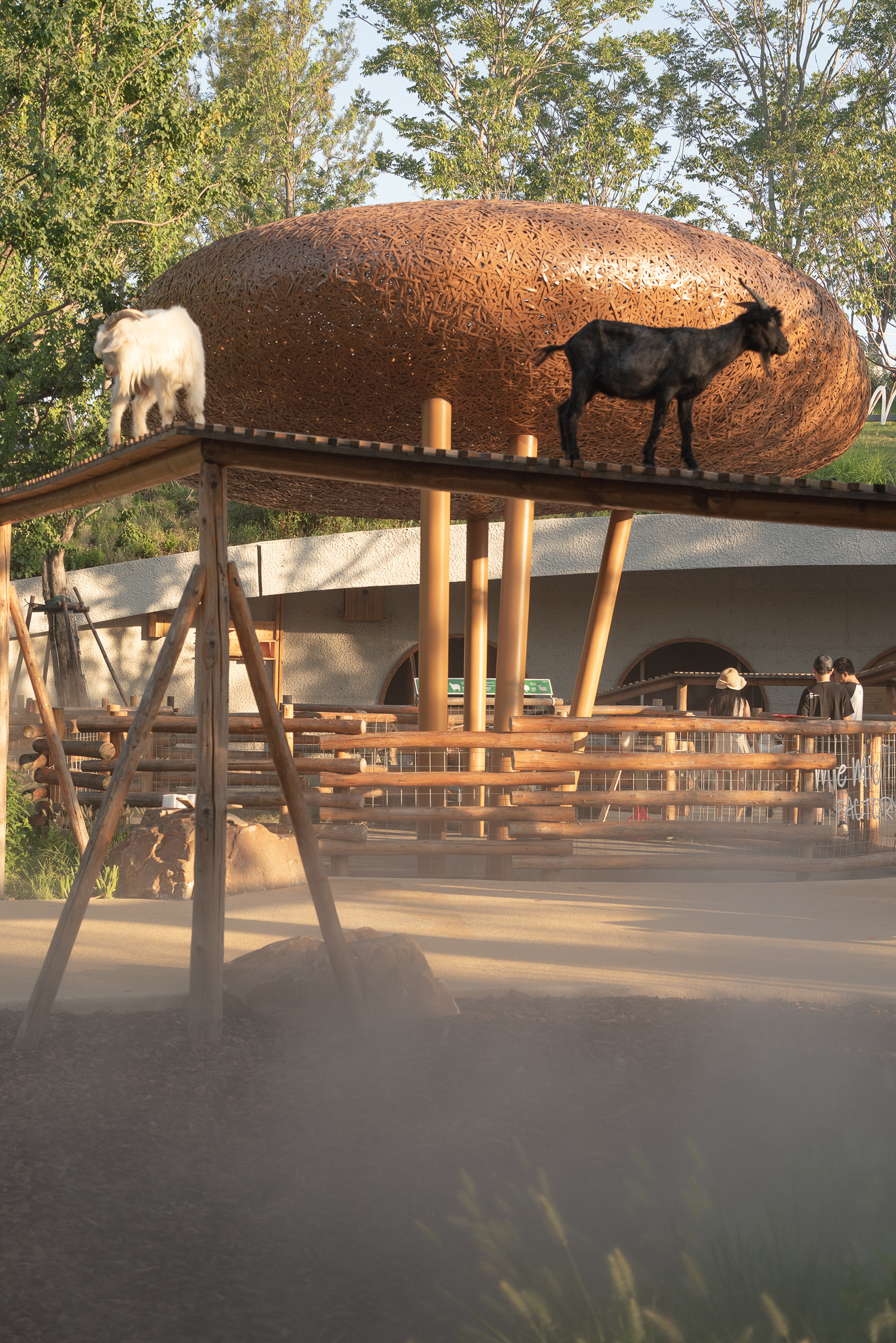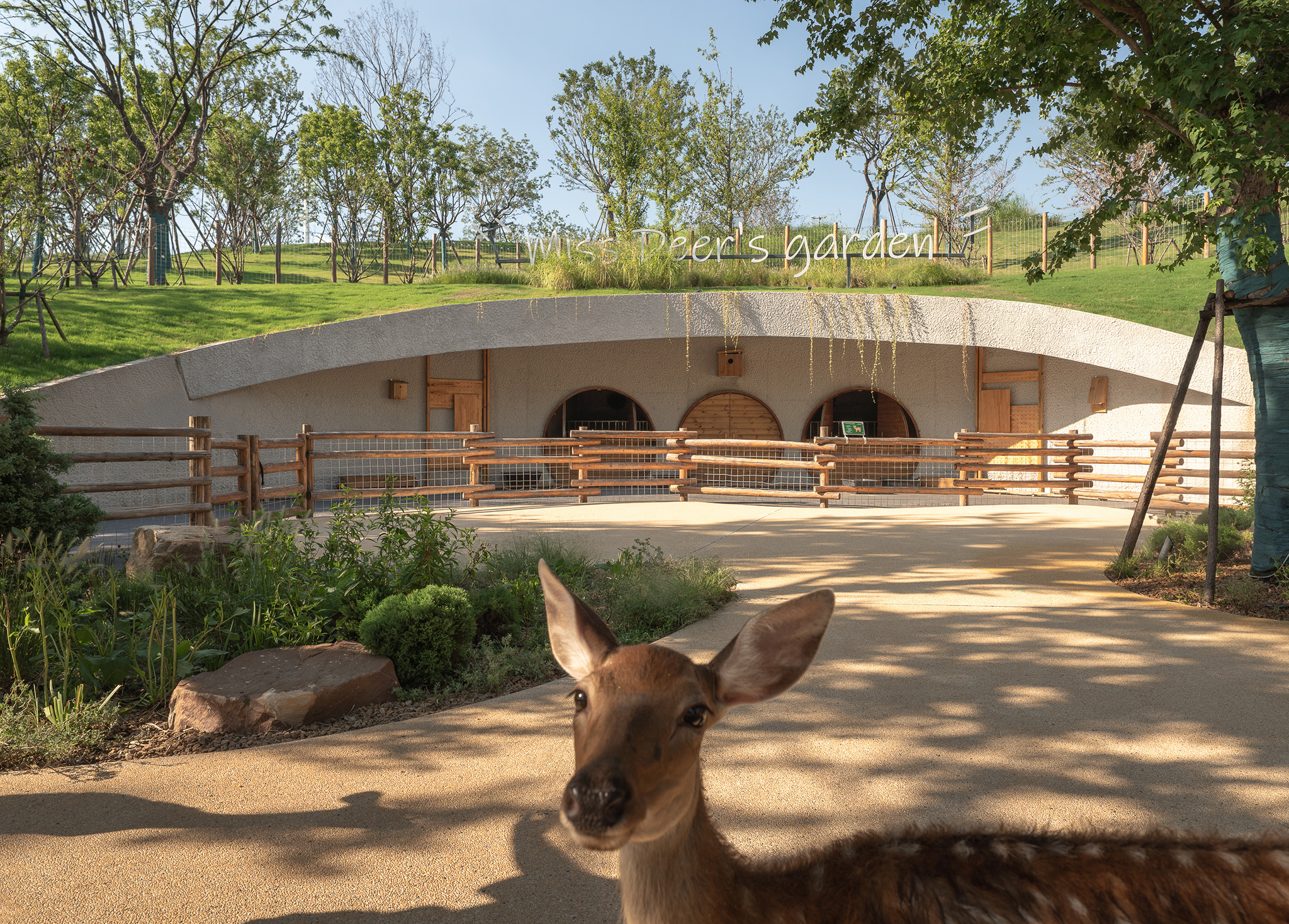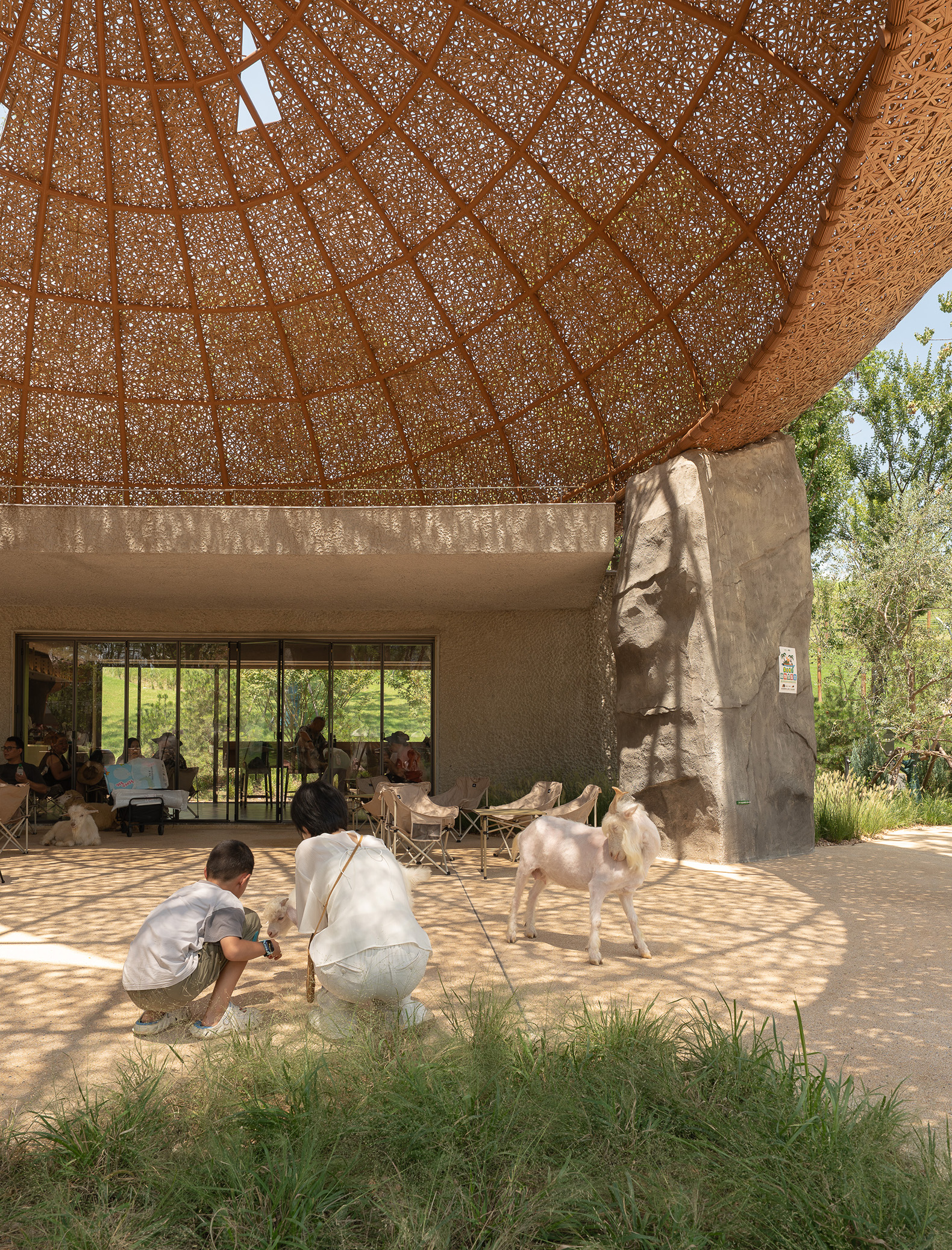 La zona de animales combina hábitat, interacción y educación ambiental, con recintos, pabellones de descanso y cafeterías que conforman un conjunto funcional. El diseño de mínima intervención sitúa los recintos bajo las laderas, minimizando su impacto visual. La suave pendiente permite que los animales deambulen por el pasto, mientras que los refugios cubiertos de tierra les brindan seguridad y comodidad.