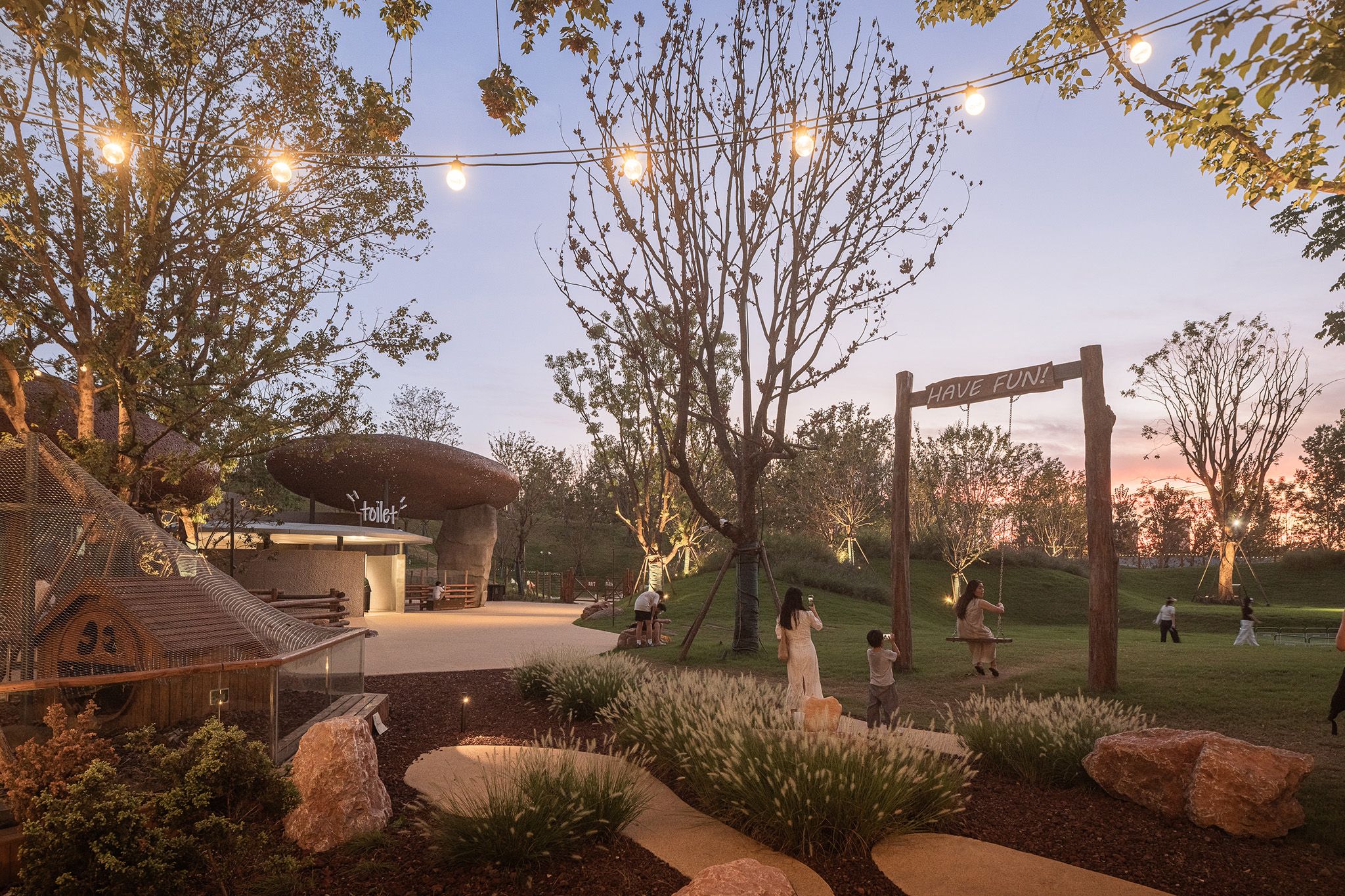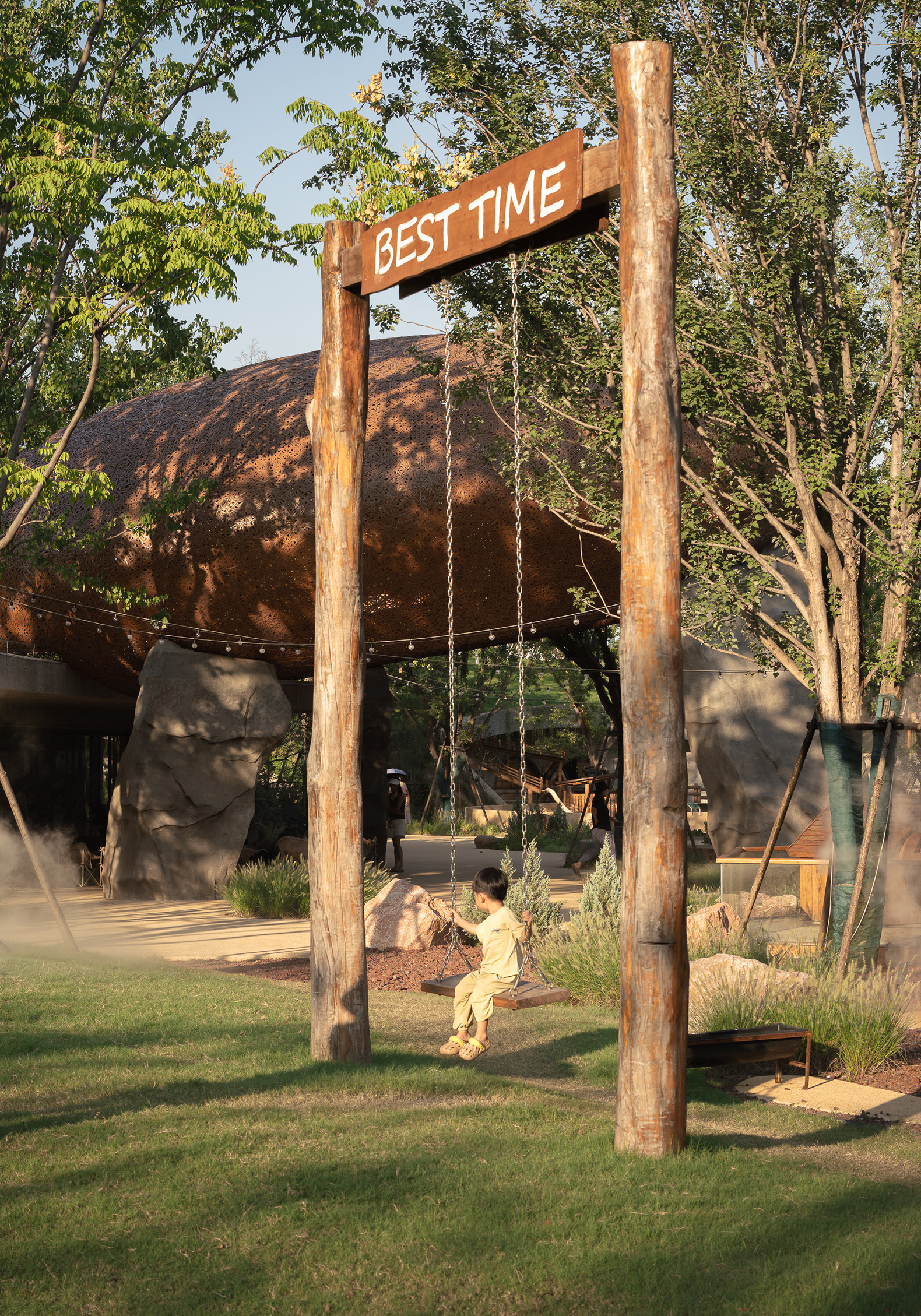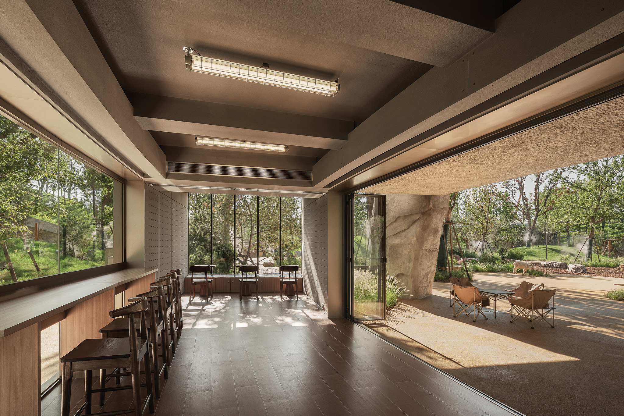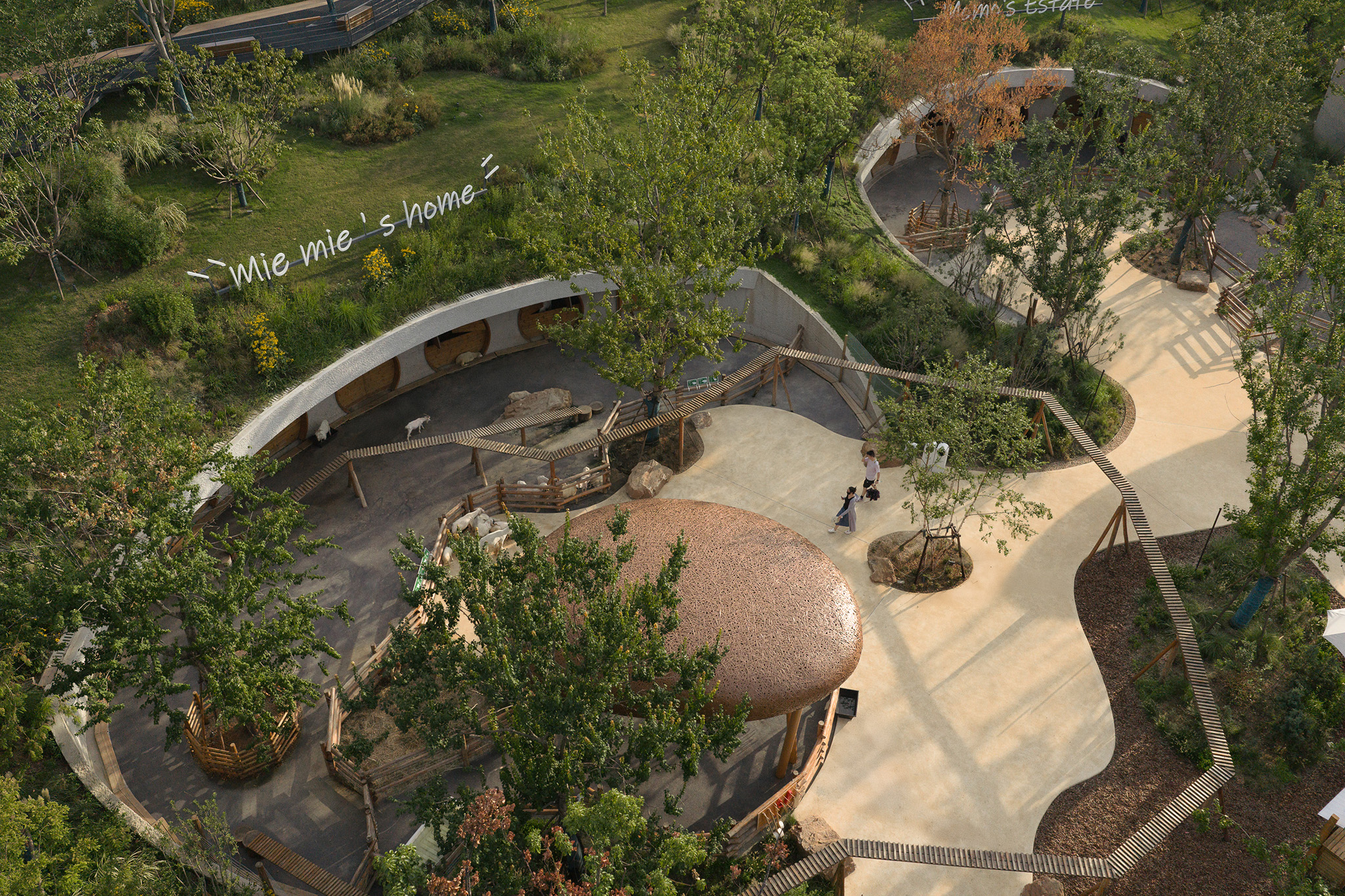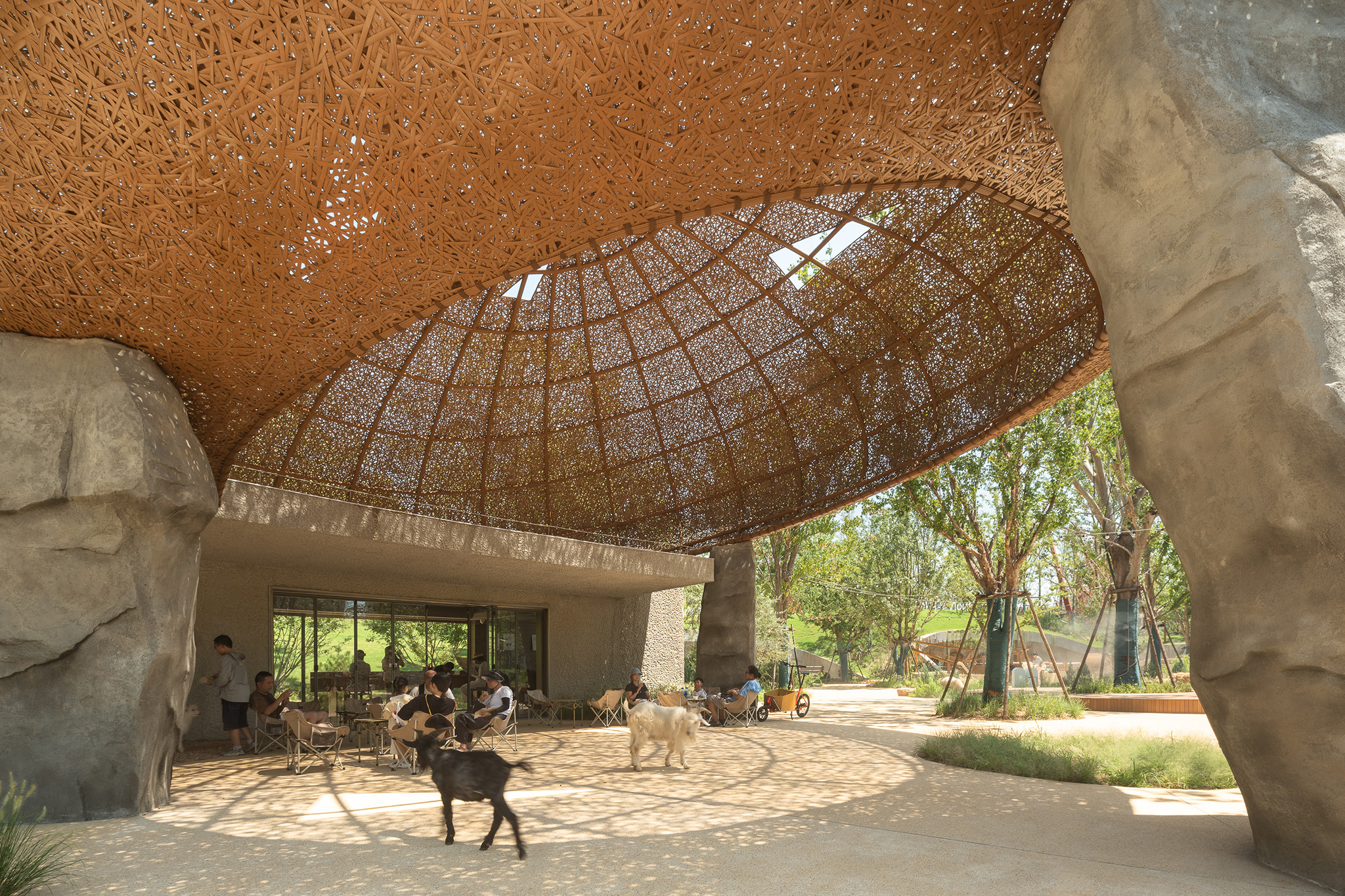 La zona de animales combina hábitat, interacción y educación ambiental, con recintos, pabellones de descanso y cafeterías que conforman un conjunto funcional. El diseño de mínima intervención sitúa los recintos bajo las laderas, minimizando su impacto visual. La suave pendiente permite que los animales deambulen por el pasto, mientras que los refugios cubiertos de tierra les brindan seguridad y comodidad.