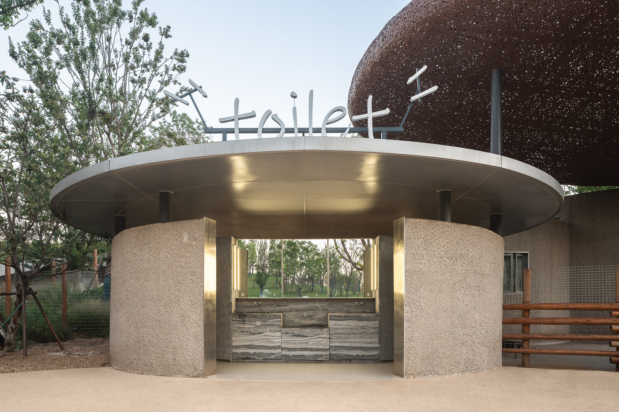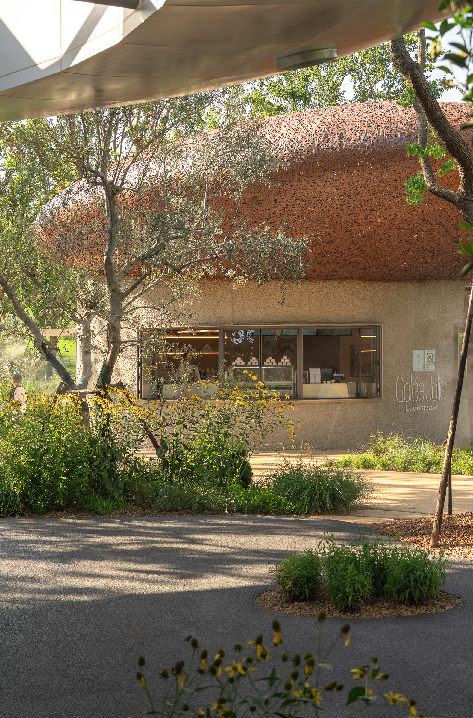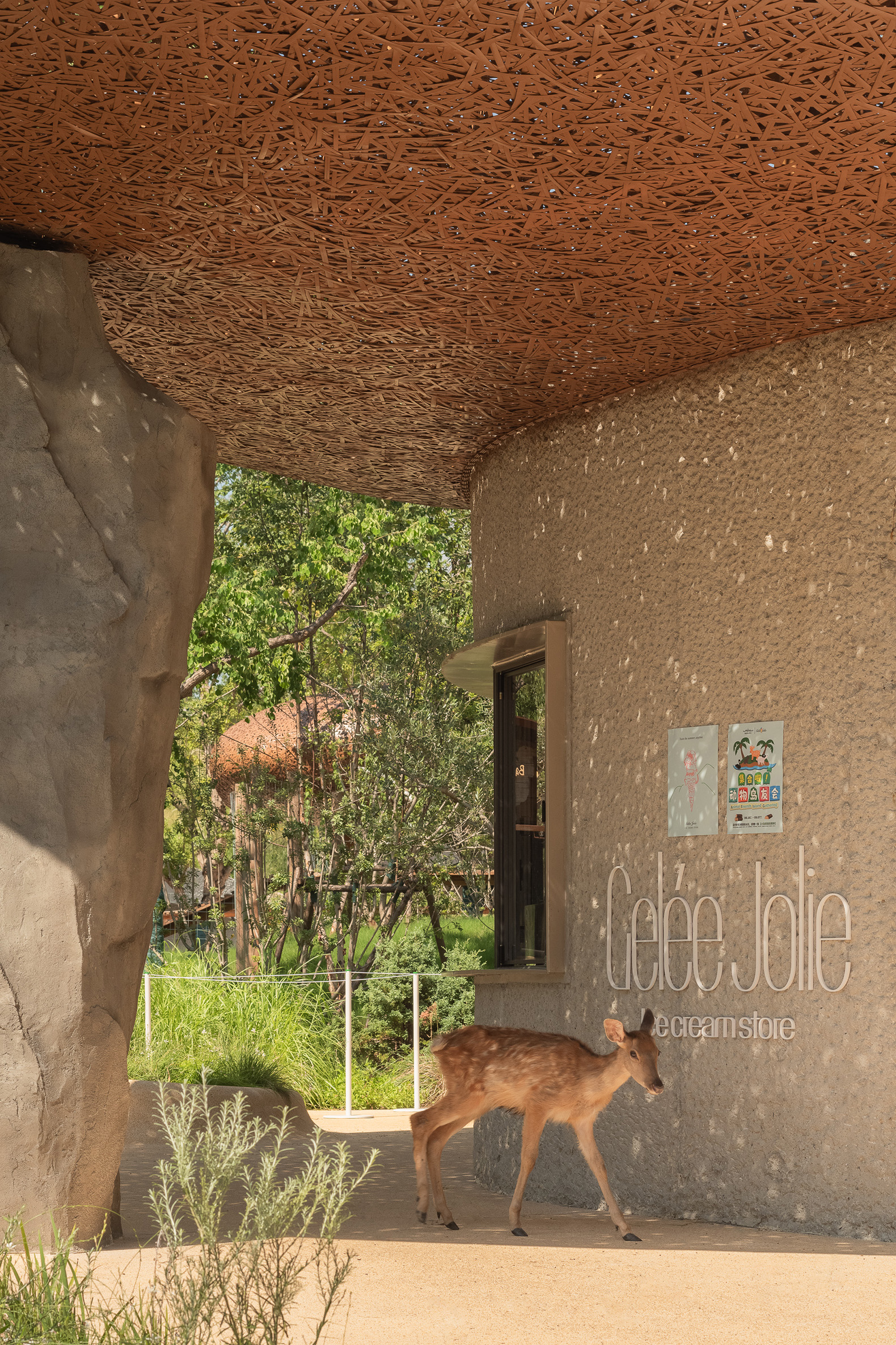Un disco plateado brilla bajo el sol, creando un animado espacio para disfrutar de helados y postres. Su fachada de textura rugosa evoca la memoria táctil y visual de las rocas de montaña. Un comedero cercano invita a los animales a detenerse, creando momentos de conexión apacible.