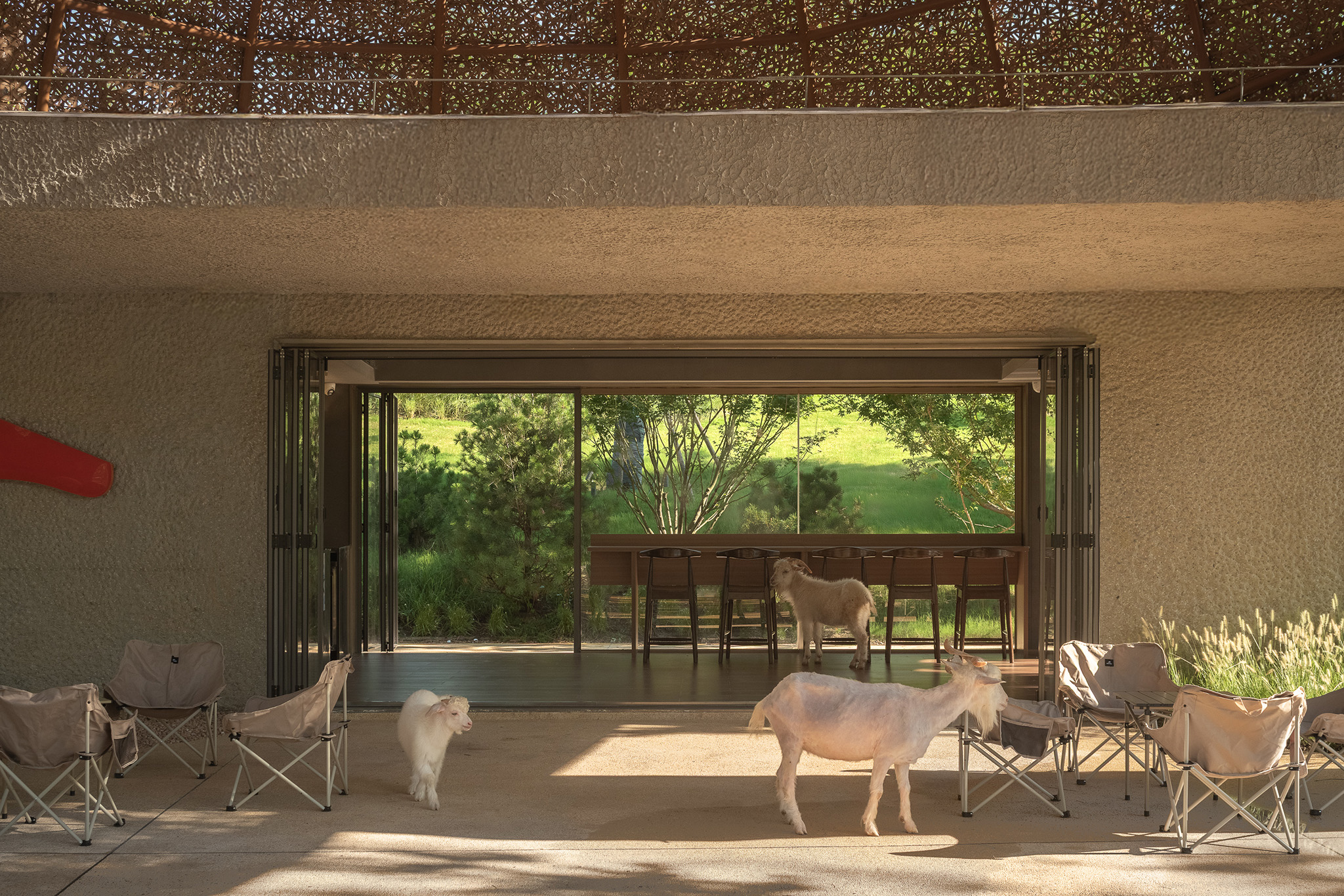 Enclavados en la ladera, los recintos de los animales están dispersos y parcialmente cubiertos por la tierra, integrándose a la perfección con el terreno. La granja se integra al paisaje circundante, difuminando las fronteras entre arquitectura y naturaleza. Cada estructura está diseñada para propiciar encuentros: entre humanos y animales, entre las personas y la naturaleza.