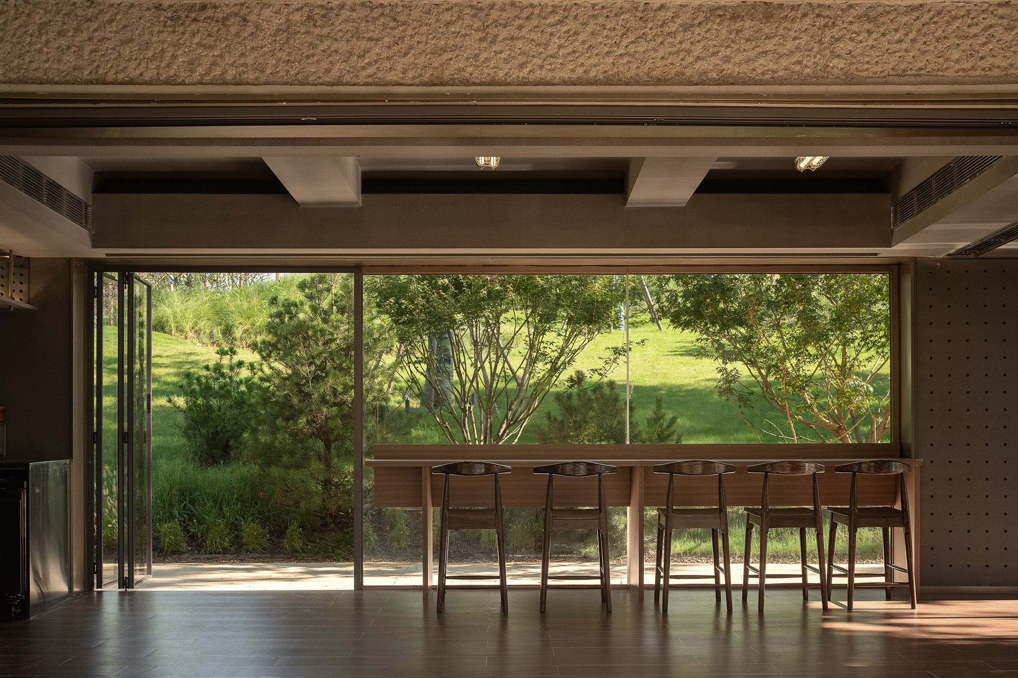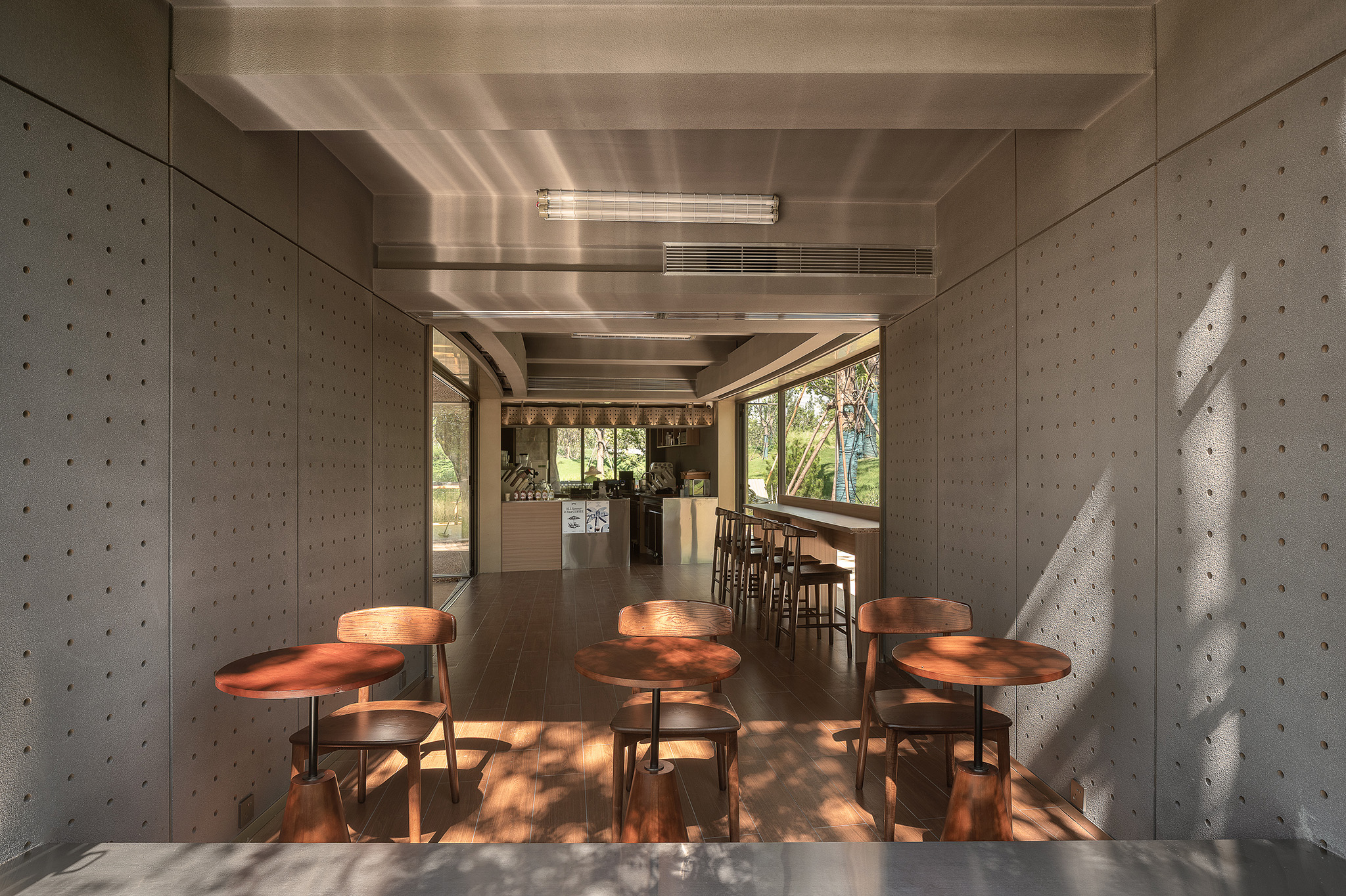 Los recortes triangulares en la cúpula de bambú proyectan dinámicos juegos de luces y sombras. Como punto de encuentro social clave, este espacio funciona a la vez como lugar de descanso y cafetería. El patio abierto se extiende hacia la vegetación circundante, cultivando una atmósfera relajada y artesanal.