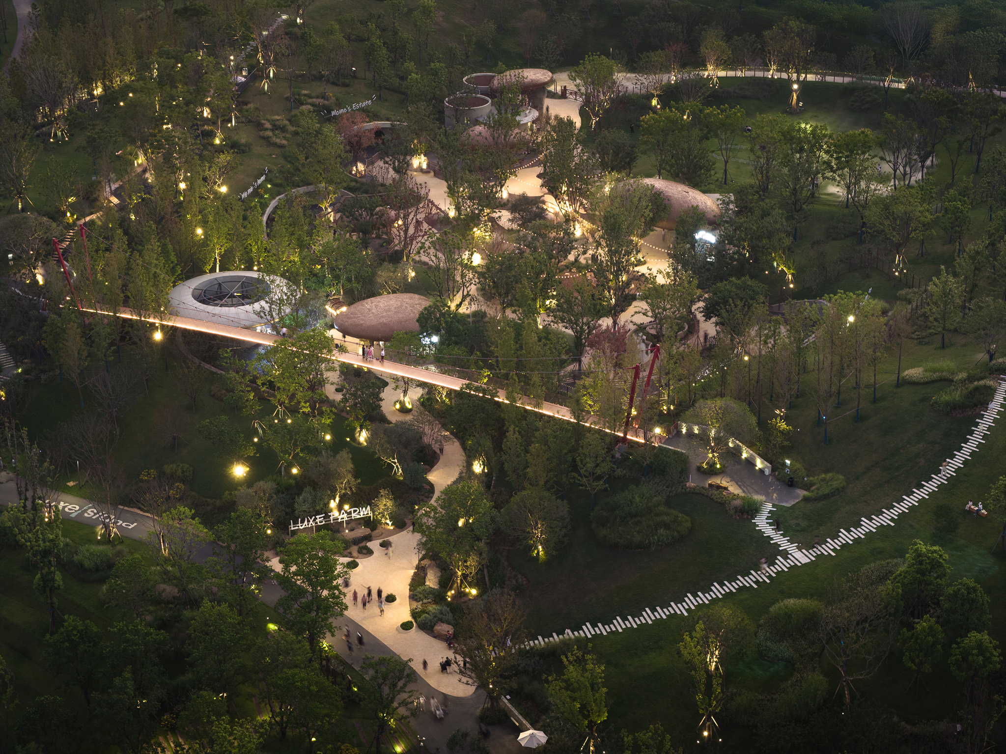 En búsqueda de una estética que combine tradición y lenguaje visual contemporáneo, la propuesta logra fusionar materiales naturales como el bambú, la madera y la piedra, con formas futuristas de edificios que parecen rocas emergiendo de la tierra. En un emplazamiento clave de la ciudad de Wuhan, la Granja LuxeIsland se concibe como una utopía urbana que permite la interacción con animales, la educación de padres e hijos y la realización de múltiples actividades de mercado y eventos.
