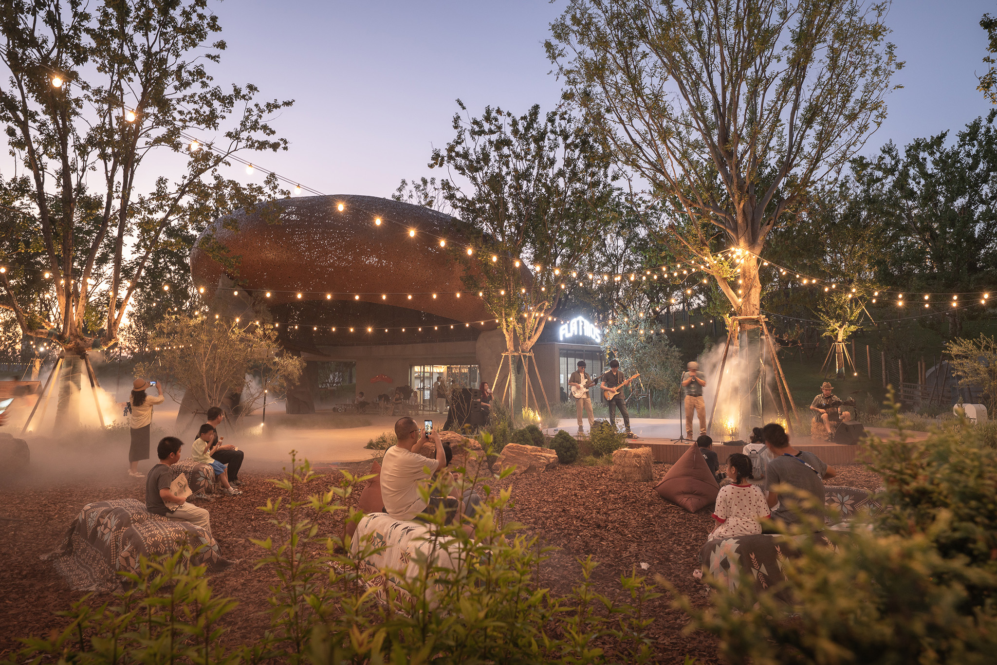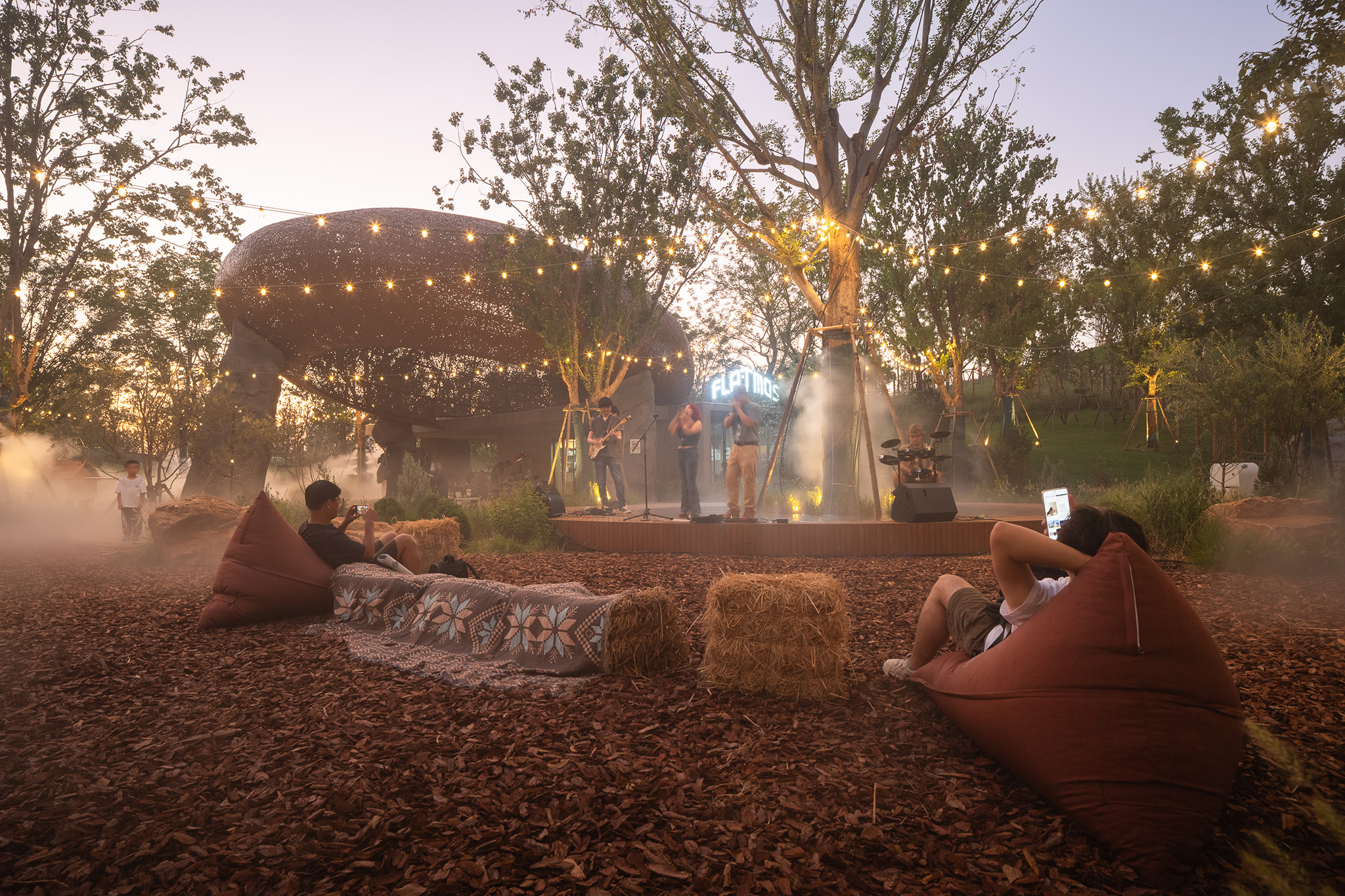 Muchas áreas de la granja están diseñadas para un uso flexible, permitiendo la realización de eventos y actividades comerciales. El suelo cubierto de aserrín, los asientos de pacas de heno y los paisajes sonoros naturales crean un escenario al aire libre que refleja el espíritu libre de la granja. Al caer la tarde, guirnaldas de luces titilan entre los árboles, convirtiendo el espacio en un lugar de encuentro teatral y cautivador.