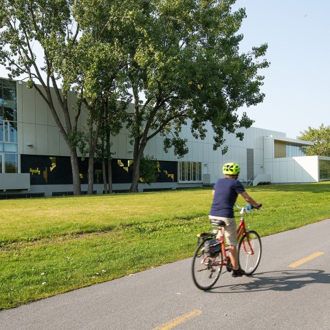 El proyecto de Les architectes FABG consiste en abrir el antiguo Guy-Gagnon arena, para dar mayor luminosidad al edificio a la vez que se crea una conexión con la naturaleza que lo rodea, y con los ciudadanos, esto se consigue colocando una serie de muros cortina en la fachada principal.