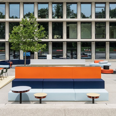 Diseñada originalmente para el Campus Axel Springer de Berlín, la colección se ha ampliado a más de 100 elementos, desde mesas de conferencia rectangulares y escritorios seccionados hasta estanterías circulares y módulos de reunión cilíndricos, que pueden configurarse de infinitas maneras, adecuadas para trabajar juntos o de forma independiente. Los paneles divisorios rectos y curvos se unen para formar rincones individuales para las llamadas privadas y el trabajo concentrado, o zonas semidescubiertas para reunirse y debatir con otras personas, mientras que los sofás en forma de anillo, los donuts y las islas blandas permiten reunirse e interactuar de manera más informal.
