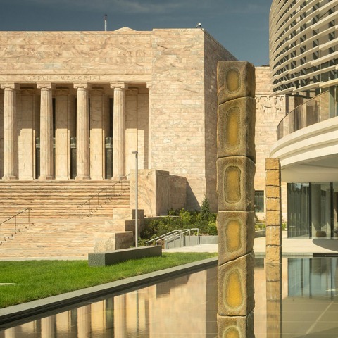 La textura horizontal de la fachada se inspira en los escalones de piedra apilados de la monumental Gran Escalera del Edificio Memorial que emergen del lado este de los edificios existentes en paralelo con la expansión. Los paneles prefabricados de color claro de la fachada están incrustados con vibrantes toques de agregado rosa que reflejan el rico mármol de color rosa de los edificios existentes.