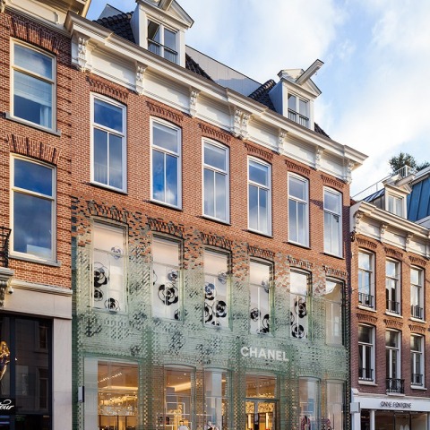 La fachada totalmente transparente de esta tienda emblemática en la calle de las tiendas de alta gama de la ciudad de Ámsterdam utiliza ladrillos, marcos de ventanas y arquitrabes de vidrio de forma que se evoca la arquitectura vernácula de la zona, con el objetivo de mantener el carácter del lugar. Los 620 m² de comercios y los 220 m² de vivienda unen la ambición de la ciudad de tener grandes comercios sin comprometer el conjunto histórico.