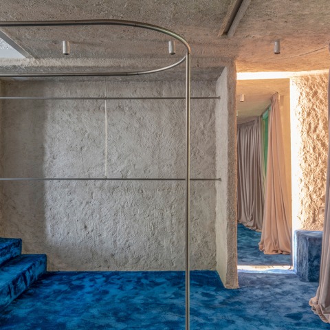 Los percheros son una construcción «excavada» en el local, revestidos de mortero proyectado, con un acabado irregular, resaltado: son las rocas; el suelo es una moqueta continua azul, de pelo largo, que tras las pisadas de los clientes dibuja olas y distintas gradaciones de azul: es el agua; y por encima, en el espacio de doble altura, unas chapas con un acabado en volumen reflejan el color azul de la moqueta (el agua en movimiento) y los colores de las ropas; es el cielo. El conjunto es como si hubiéramos metido una pequeña cala de Cadaqués en este local. Y el mueble central es algo así como una barca de pescadores anclada en el medio. Incluso los probadores, acabados en una pintura estucada de color turquesa, con una moqueta de igual color, pueden verse como cuevas en el mar, donde aparecen nuevos colores y texturas.