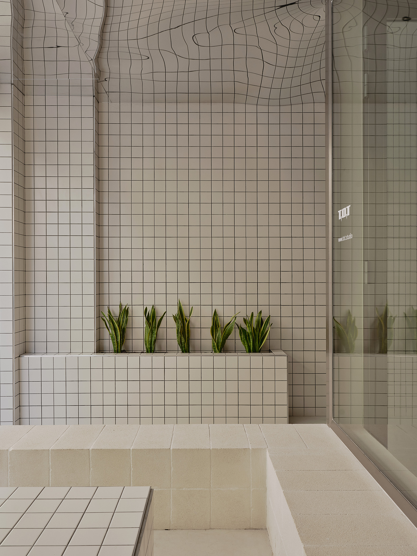 La llegada al estudio está concebida como el punto de partida conceptual. La entrada reproduce la lógica material de muchas arquitecturas urbanas de Tokio, donde el azulejo 10×10 blanco envuelve fachadas completas. Aquí, ese mismo azulejo construye un umbral limpio y casi exterior, reforzado por un gran espejo en el techo que duplica el espacio y altera la proporción de la estancia. Este recurso genera la sensación de que el visitante sigue en el exterior incluso después de haber entrado, diluyendo el límite entre calle y estudio. Una bancada en bloque blanco de hormigón introduce uno de los materiales que posteriormente se repite en varios puntos del proyecto, anticipando su función estructuradora.