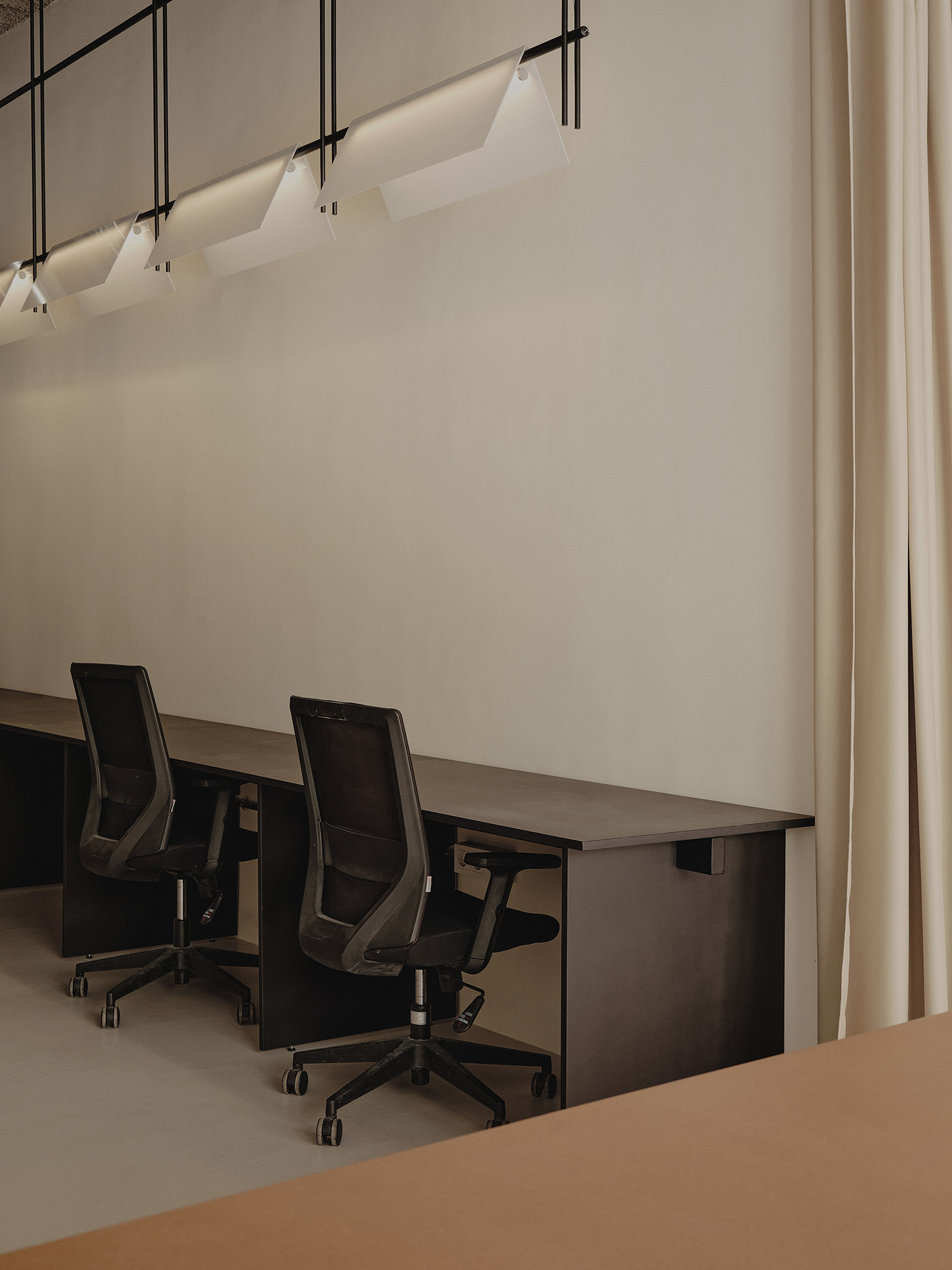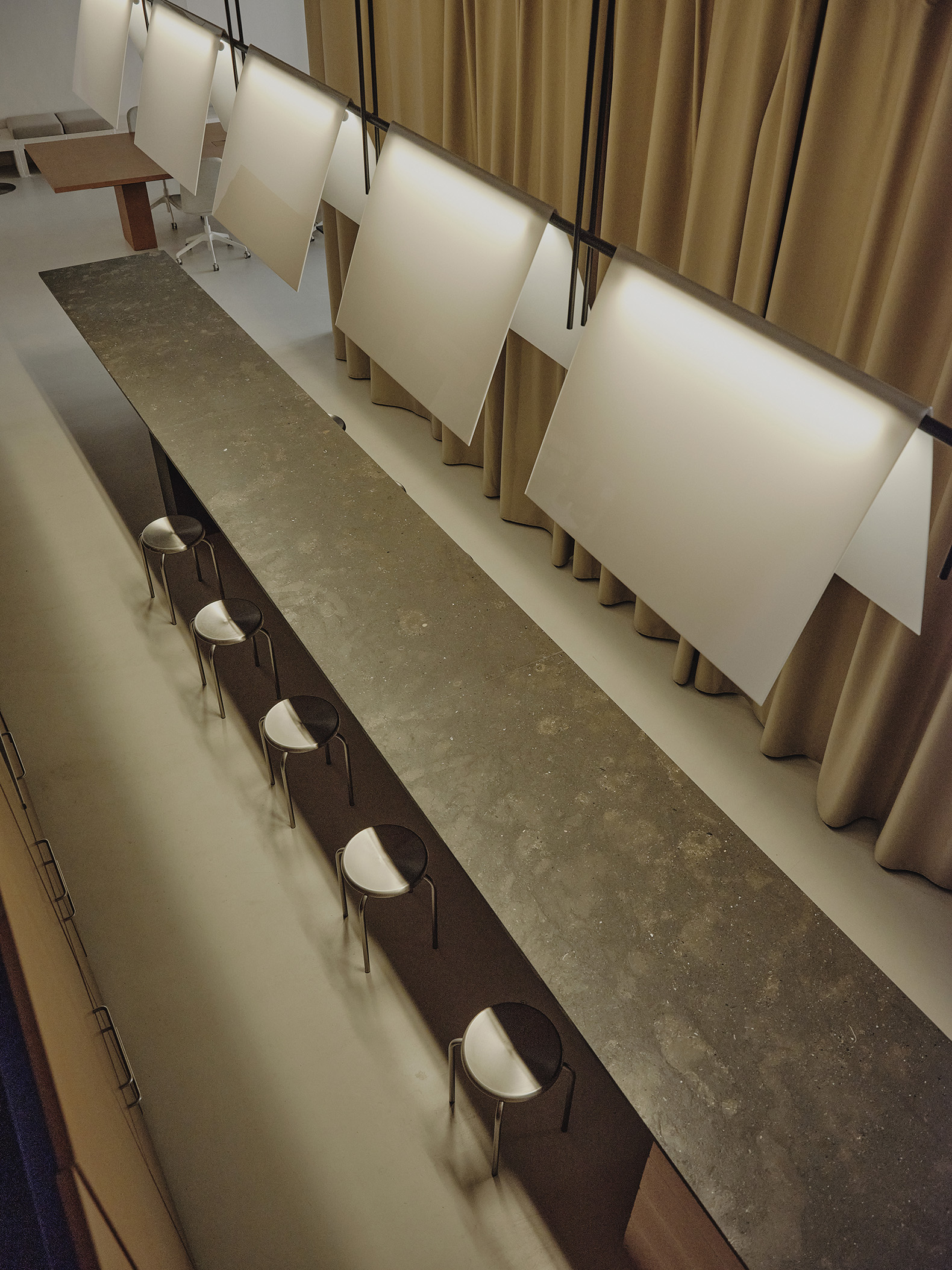 Tras este umbral, el espacio se articula en torno a su pieza central: una gran barra que recorre el local en forma de U. Ejecutada en DM tintado en negro, coloreado en masa para conservar la textura propia del material, esta pieza organiza usos y circulaciones. La barra funciona simultáneamente como espacio de trabajo para coworkers, vitrina y zona social. El tramo central integra una mesa de 7,20 metros parcialmente volada resuelta con una estructura de hierro, piedra negra San Vicente y una pata escultórica de bloque blanco.