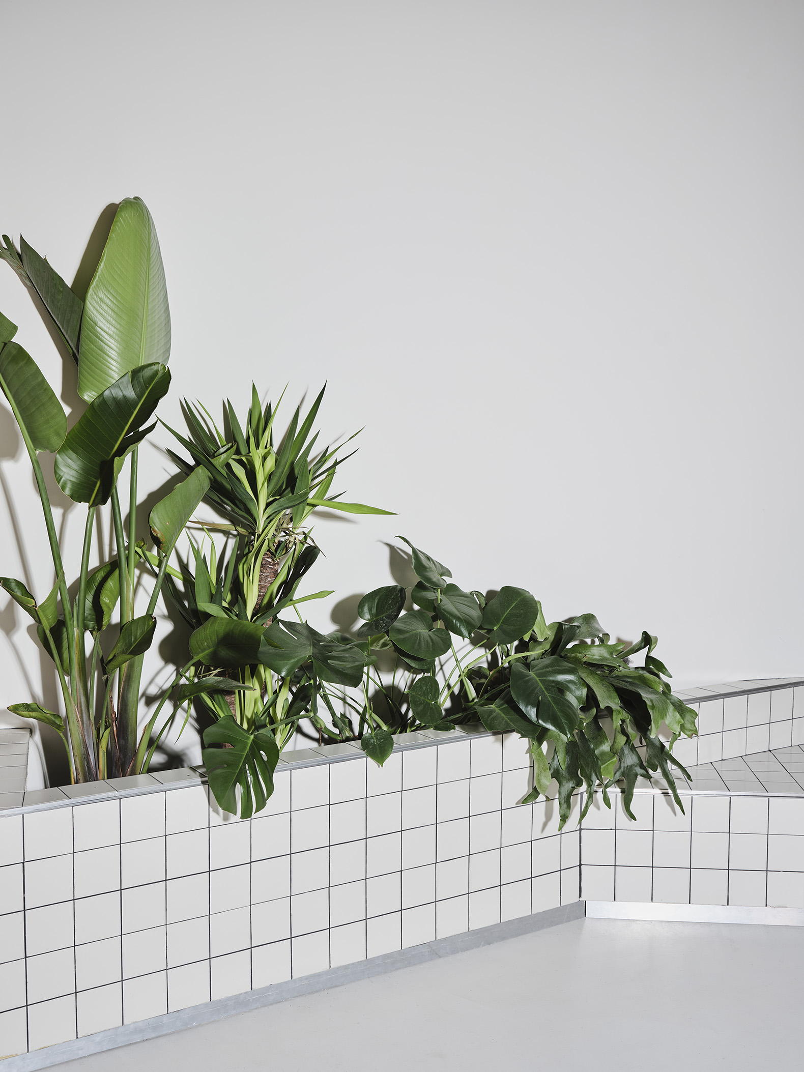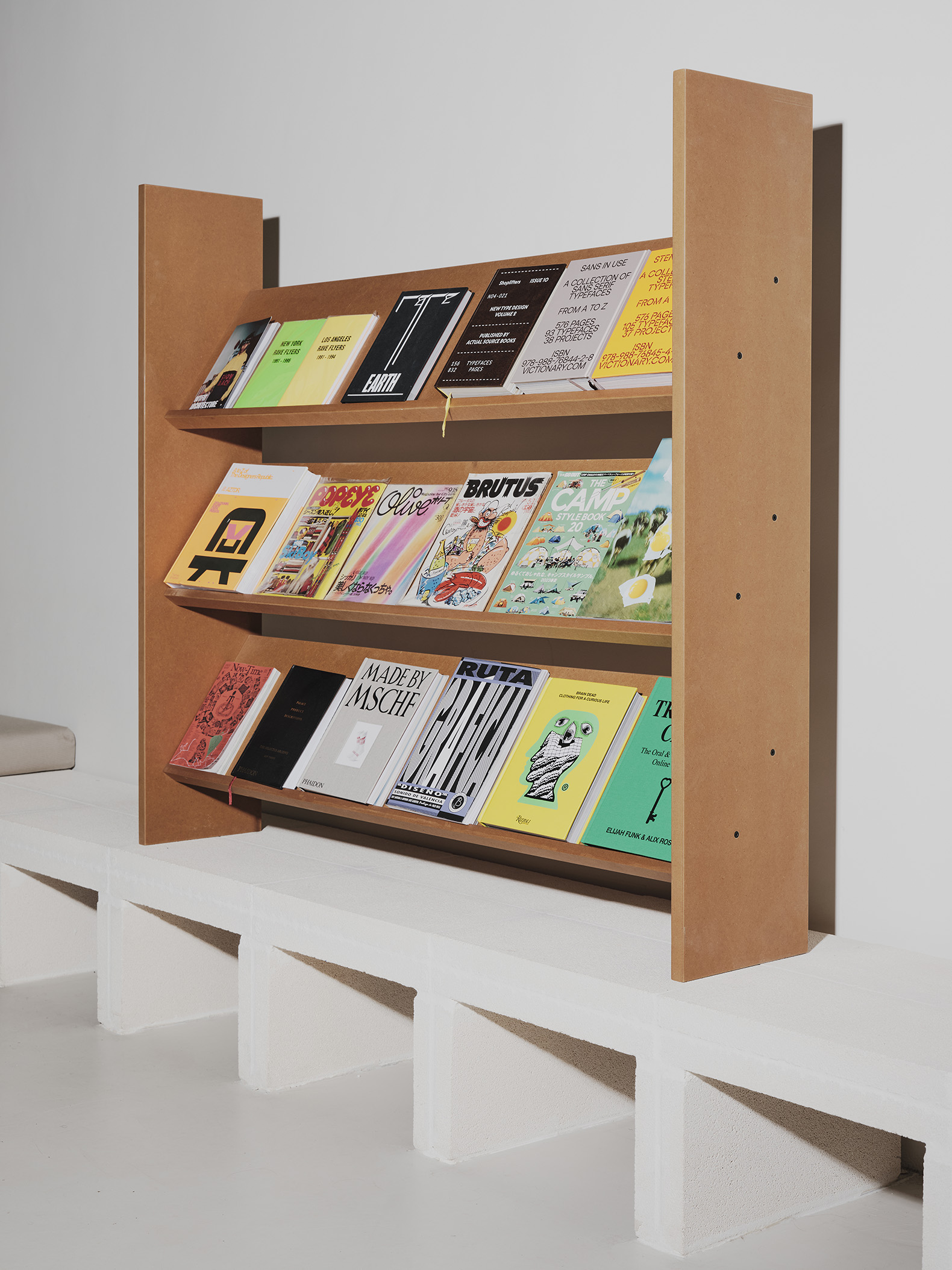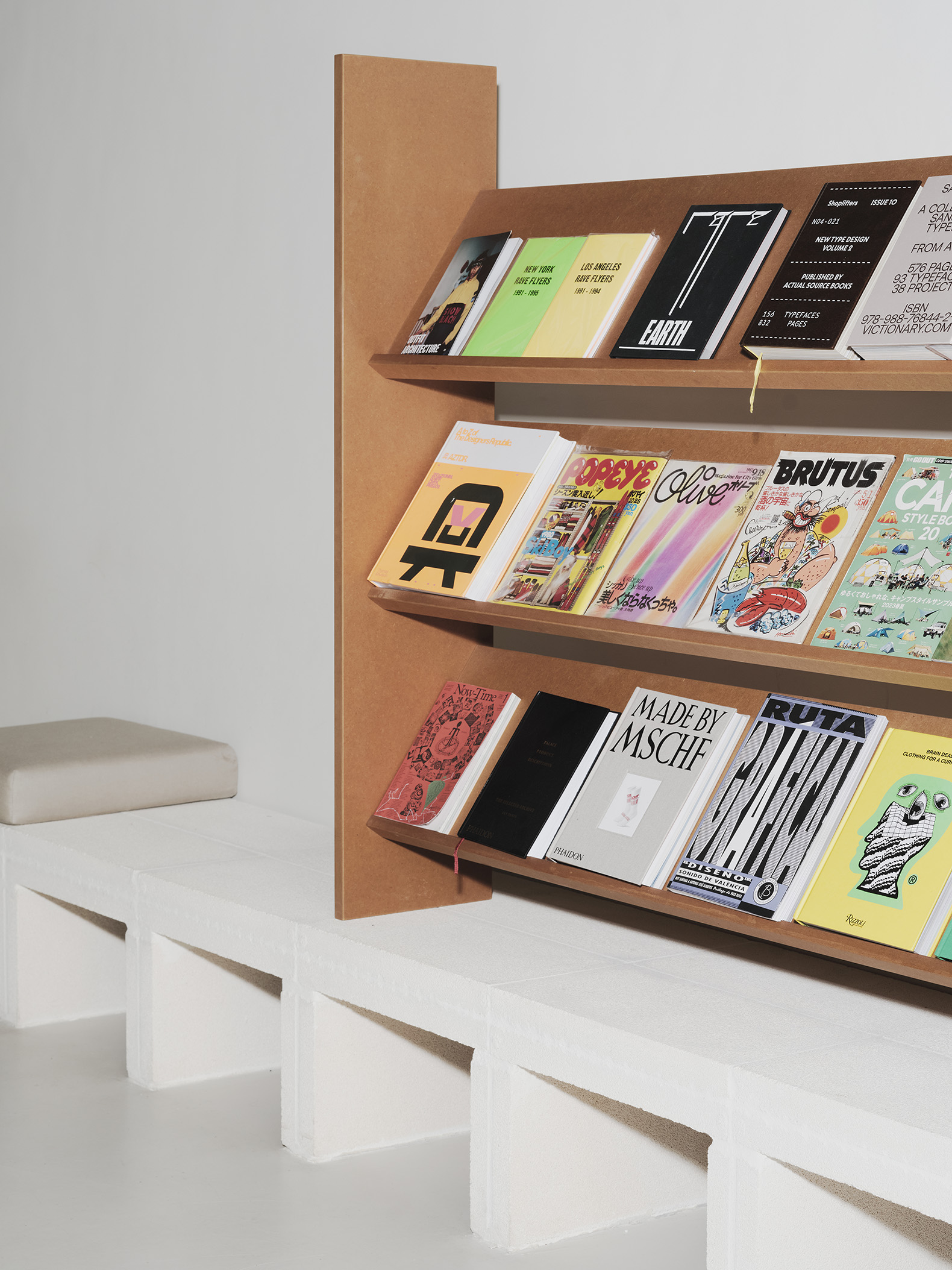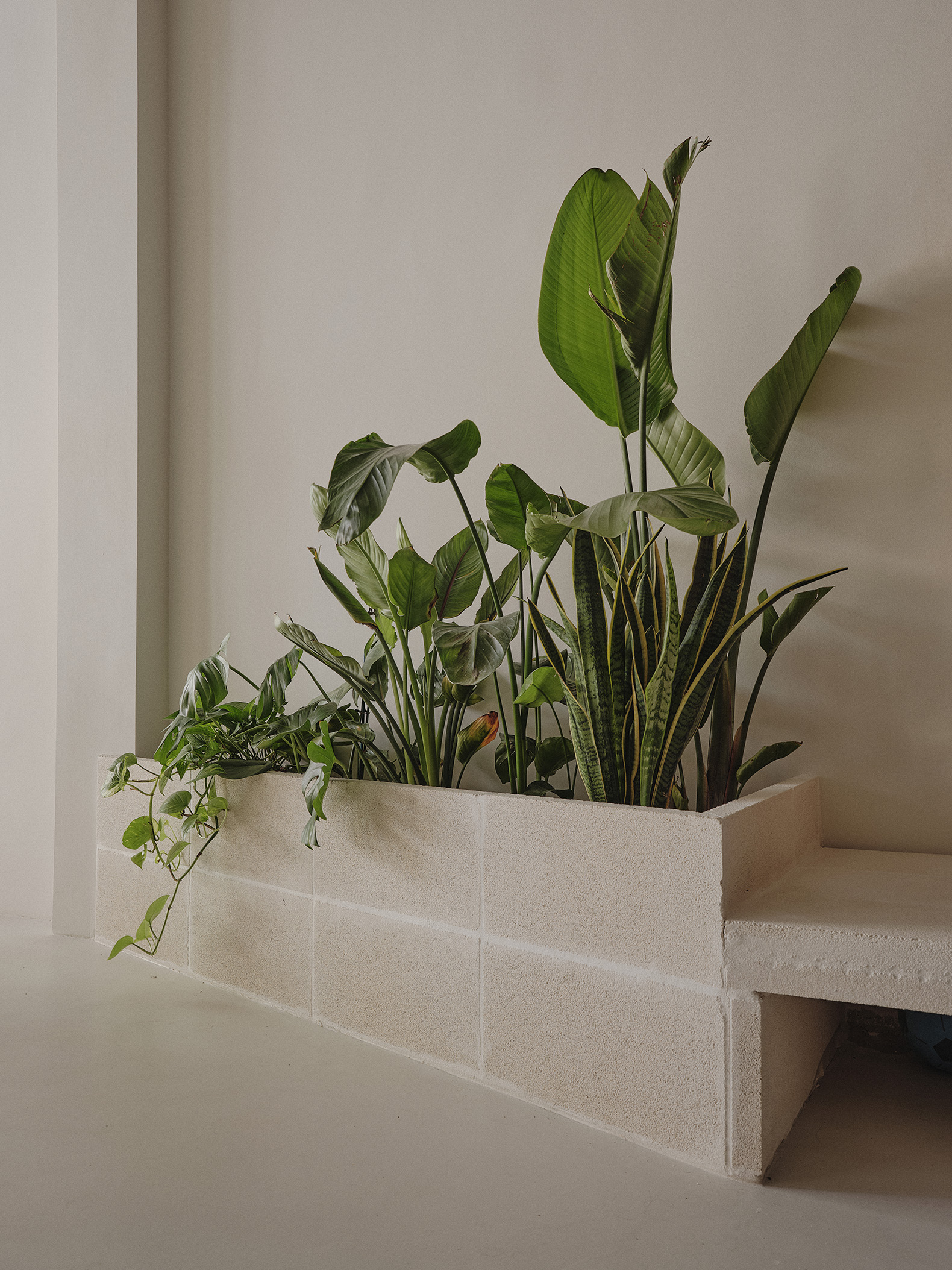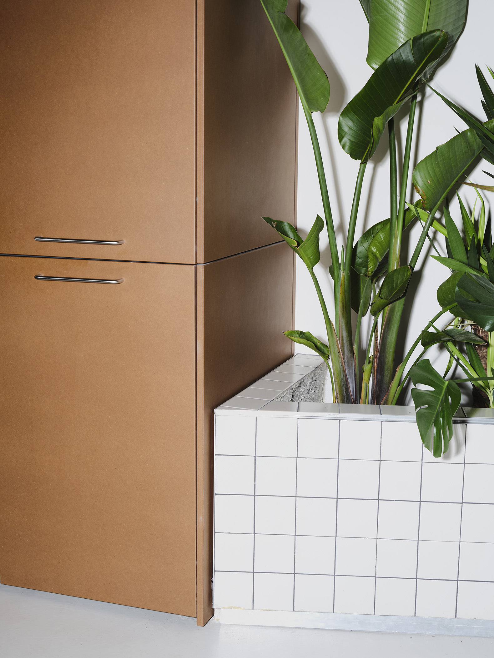 Los tatamis perimetrales de bloque blanco permiten sentarse, reunirse o convertirse en zonas informales durante eventos internos y, en algunos puntos, funcionan también como jardineras, reforzando la idea de un espacio activo y múltiple. El mobiliario de trabajo, como mesas, cocina o almacenaje, se resuelve en DM crudo mediante un sistema constructivo sencillo y limpio, diseñado para convivir con las piezas fijas y con la condición expositiva del espacio. Todas las piezas realizadas a medida han sido fabricadas por la firma valenciana Lebrel Furniture.