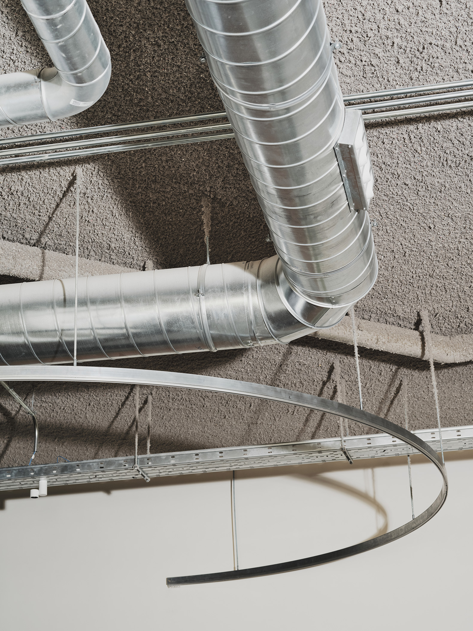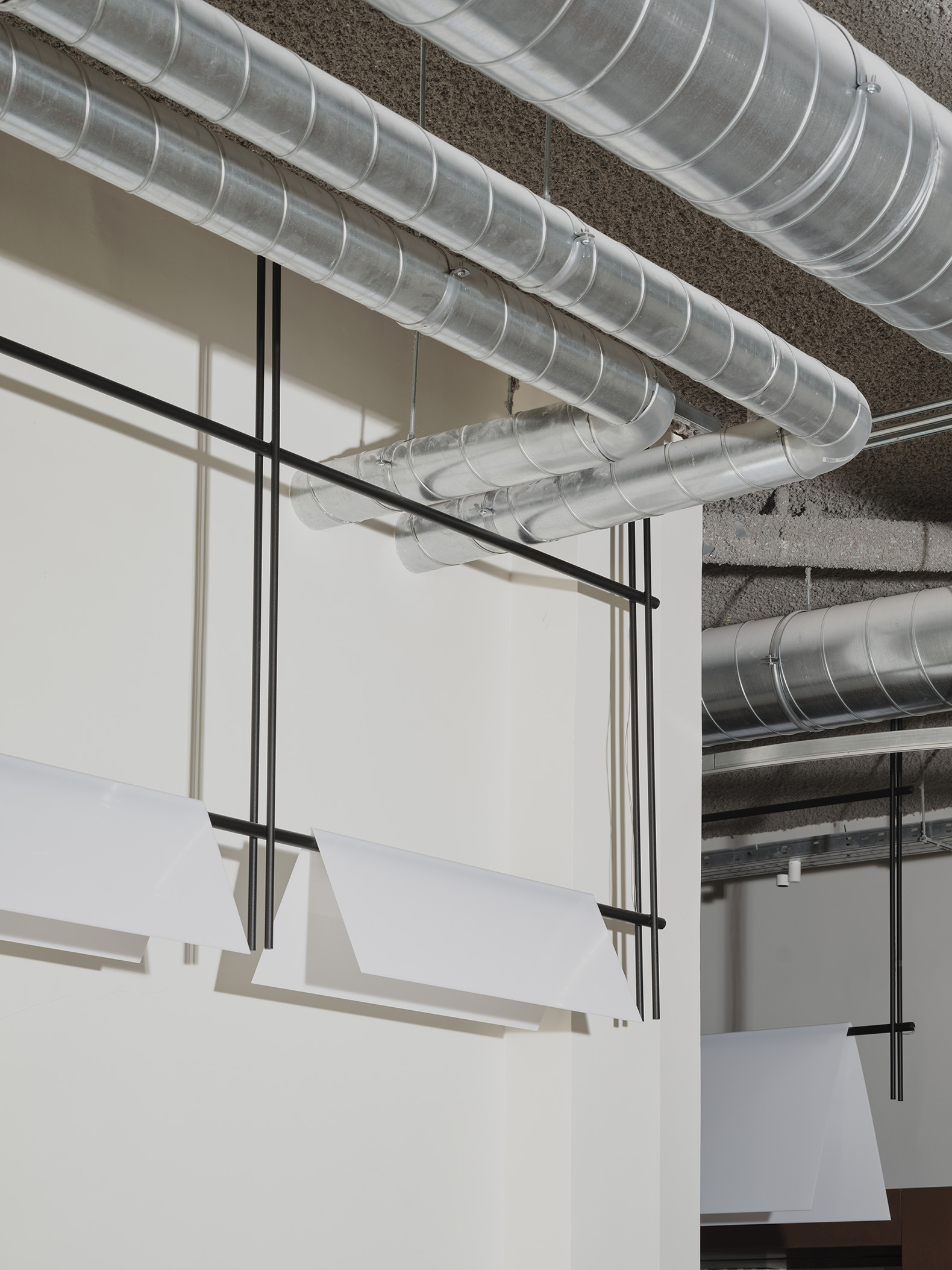 La materialidad del proyecto responde a una lógica de coherencia y repetición, características habituales en el trabajo de Paloma Bau. El pavimento de microcemento claro unifica todo el recorrido y aporta una luminosidad homogénea. El techo de celulosa proyectada actúa como plano técnico y fonoabsorbente, dejando a la vista las instalaciones en crudo y los carriles que permiten dividir el espacio mediante cortinas. Estas líneas curvas introducen una lectura más dinámica y matizada, rompiendo sutilmente con el orden general del local.