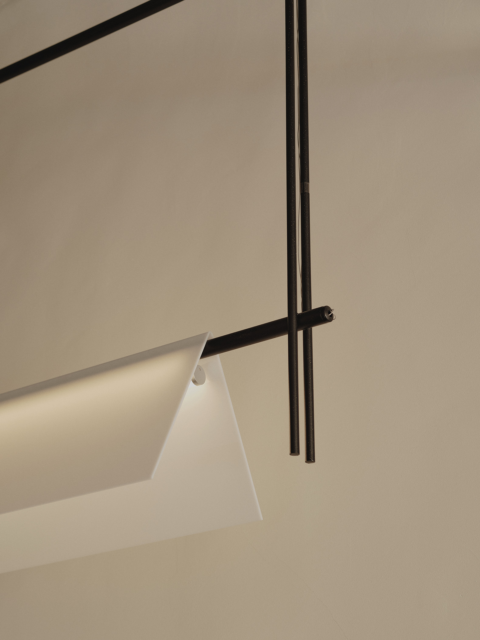 La barra se acompaña de una luminaria longitudinal diseñada específicamente para el proyecto, inspirada en los noren, esas piezas textiles que suelen marcar el umbral de tabernas y locales japoneses. La presencia de esta lámpara, suspendida a lo largo de toda la barra, introduce un ritmo horizontal que acompaña la escala del espacio y contribuye a su atmósfera cálida y contenida.