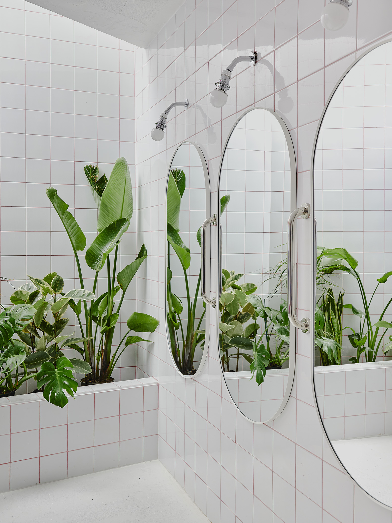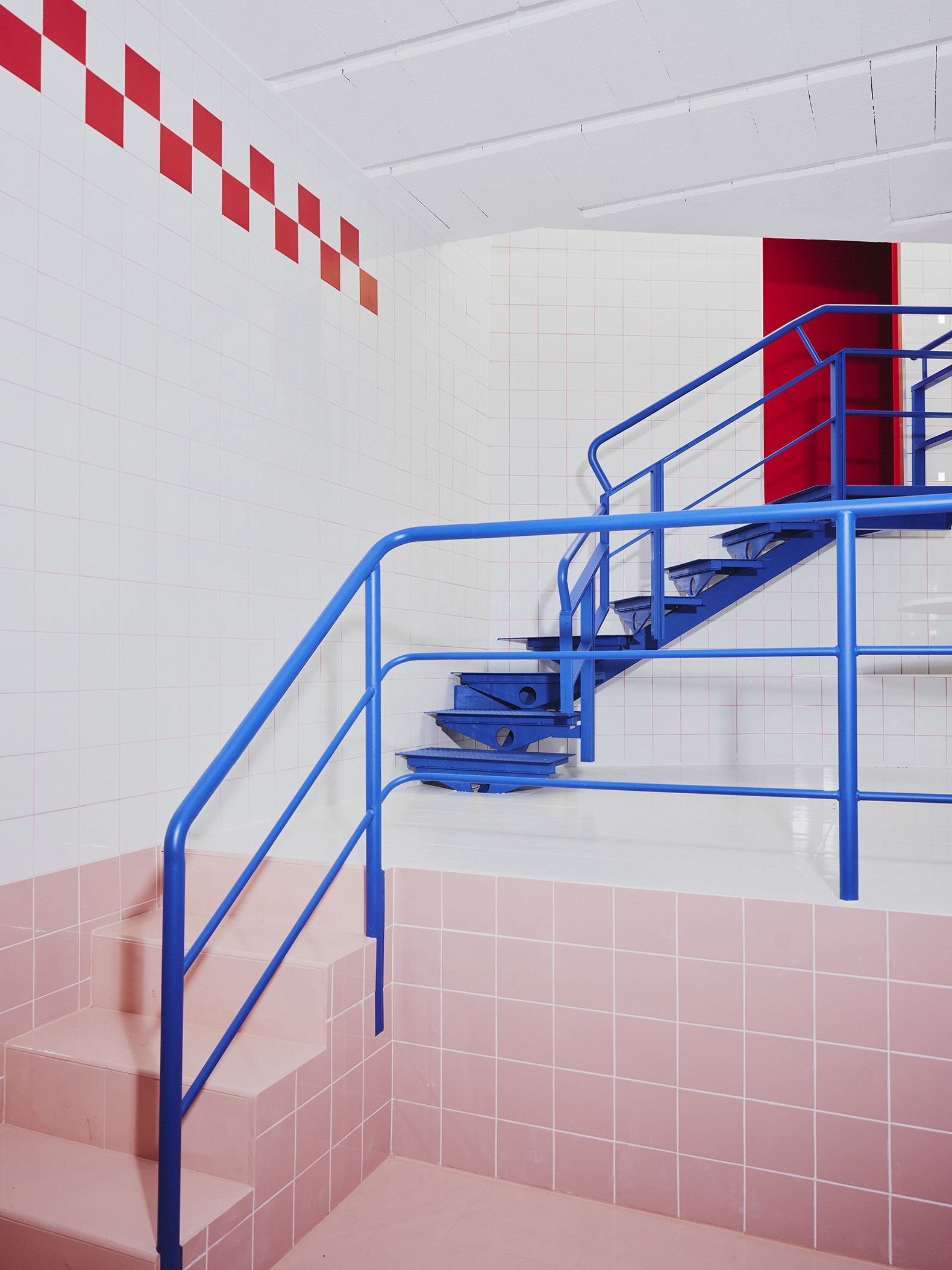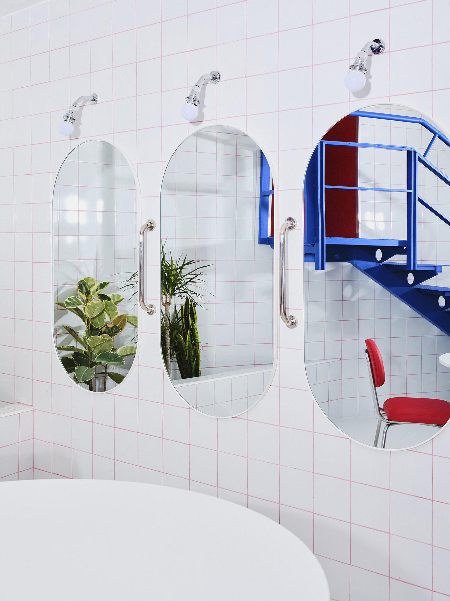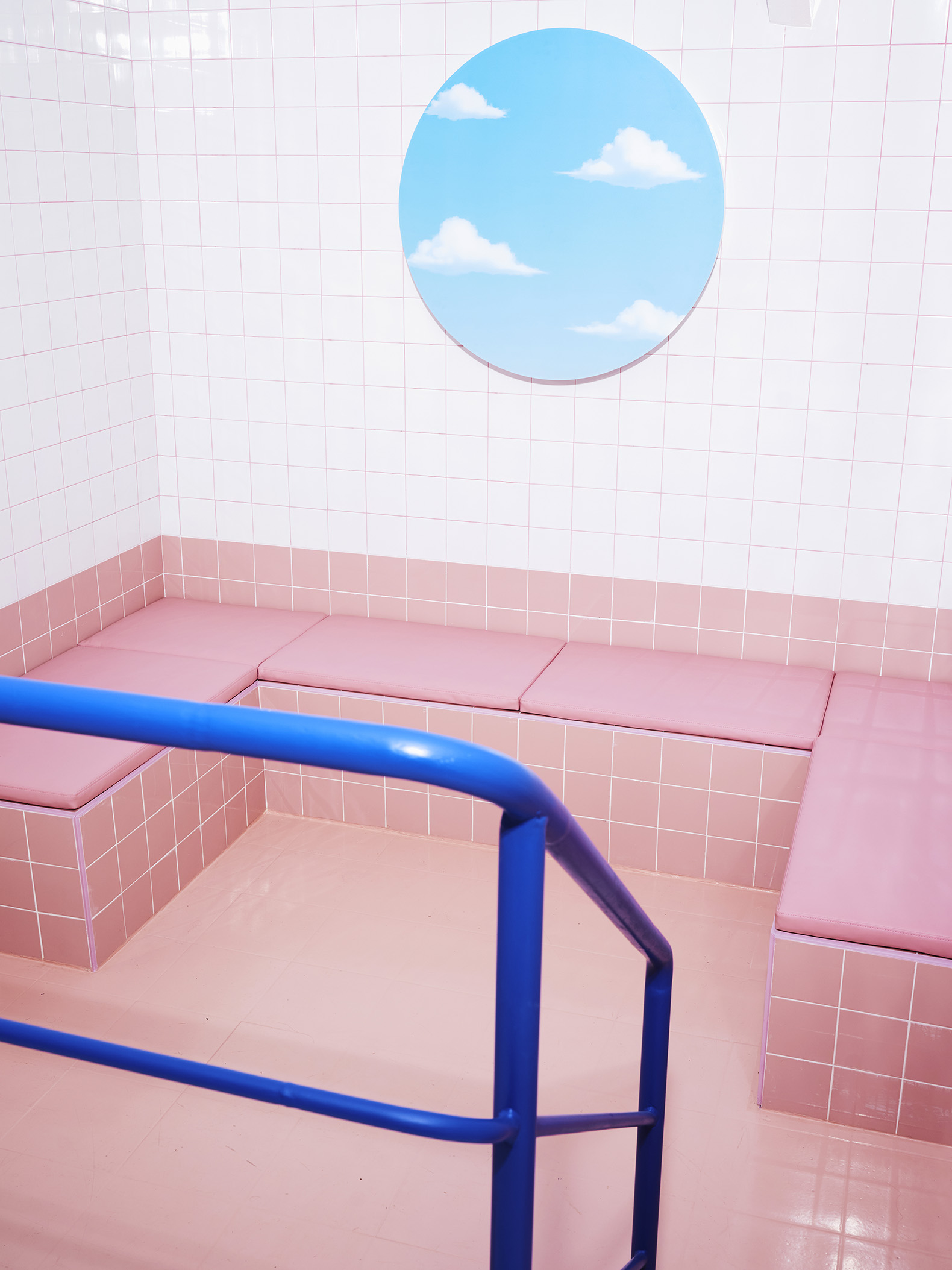 Uno de los tatamis perimetrales sirve como umbral y se complementa con una pieza de granito, un guiño a los accesos tradicionales de la vivienda japonesa. En el interior, la intensidad cromática, las luminarias realizadas a partir de cabezales de ducha, los espejos con asideros propios de las áreas de baño y un falso lucernario con una pequeña jardinera construyen una imagen más divertida y experimental. Incluso un neón con un cielo sustituye irónicamente al habitual monte Fuji presente en muchos onsen. Además del factor sorpresa que genera este espacio, los baños adyacentes, resueltos en un rojo intenso, refuerzan ese contraste y aportan un matiz ligeramente provocador.