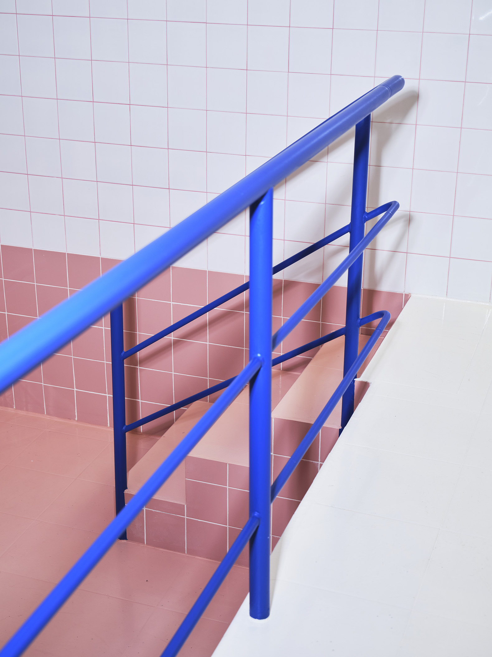 El segundo ámbito conceptual del proyecto se encuentra en uno de los recovecos originales del local y funciona como sala de reuniones. Inspirada en los onsen, esta estancia se concibe como un ambiente independiente que rompe deliberadamente con la sobriedad general del estudio. El acceso se realiza a través de una pequeña escalera oculta en el panelado de la cocina, donde deja intuir una puerta en azul Klein que anticipa el cambio de atmósfera.