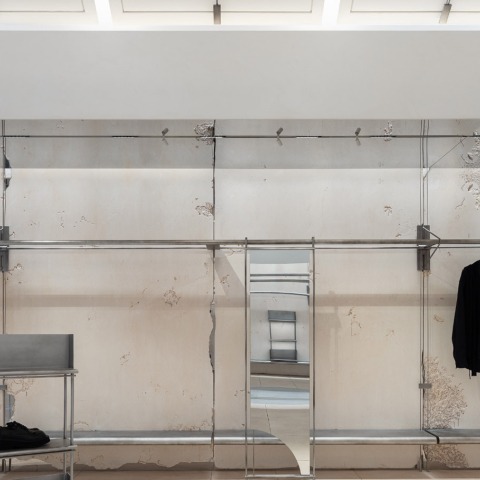 El probador, como zona más privada de la tienda, es donde brilla más el diseño orientado al detalle. Los ganchos para ropa son una evolución de los «alfileres de fijación» utilizados en la confección de prendas de vestir; la piedra, que actúa como superficie del espacio, muestra texturas naturales y colores cálidos, creando una atmósfera más relajada. Teniendo en cuenta la posibilidad de que la textura rugosa de la piedra raye a los visitantes o la ropa, su superficie se ha pulido cuidadosamente. Esto no sólo conserva la belleza natural del material, sino que también resalta la búsqueda definitiva de la marca de ofrecer una experiencia de consumo excepcional.