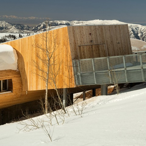 La casa de esquí de cinco habitaciones consta de 4400 pies cuadrados de espacio habitado más un garaje y espacio mecánico. Se llega a la casa desde la carretera, mirando por encima del tejado hacia las montañas. Tanto los peatones como los vehículos acceden a la casa a través de un puente de acero perforado. Al entrar, se desciende una escalera transparente iluminada por un tragaluz en lo alto. Desde un vestíbulo bajo, se ingresa al gran salón monumental con un techo alto y curvo de cedro. El lado sur de la casa ofrece una ventana continua de 88 pies de largo, que controla pasivamente la ganancia de calor solar y enmarca las espectaculares vistas del sur. En el extremo occidental de la casa, una terraza cubierta ofrece vistas del atardecer hacia el valle. El mejor dormitorio y sala multimedia ocupan el extremo este de la casa. El «núcleo» de hormigón de una sola tabla contiene cuatro dormitorios de invitados en dos niveles. La planta baja ofrece un servicio de acceso directo a las pistas de esquí.