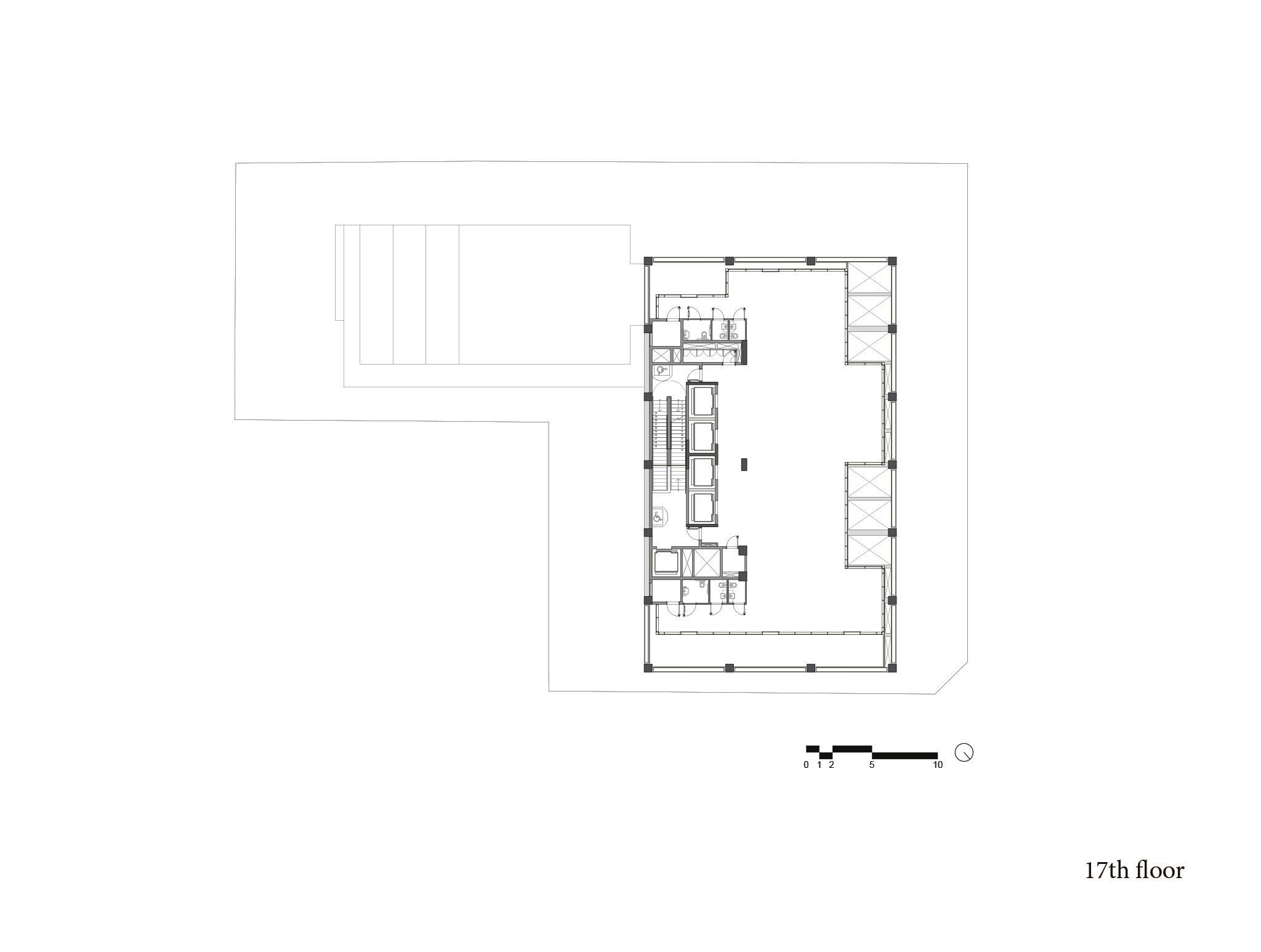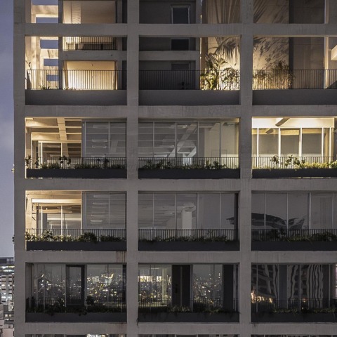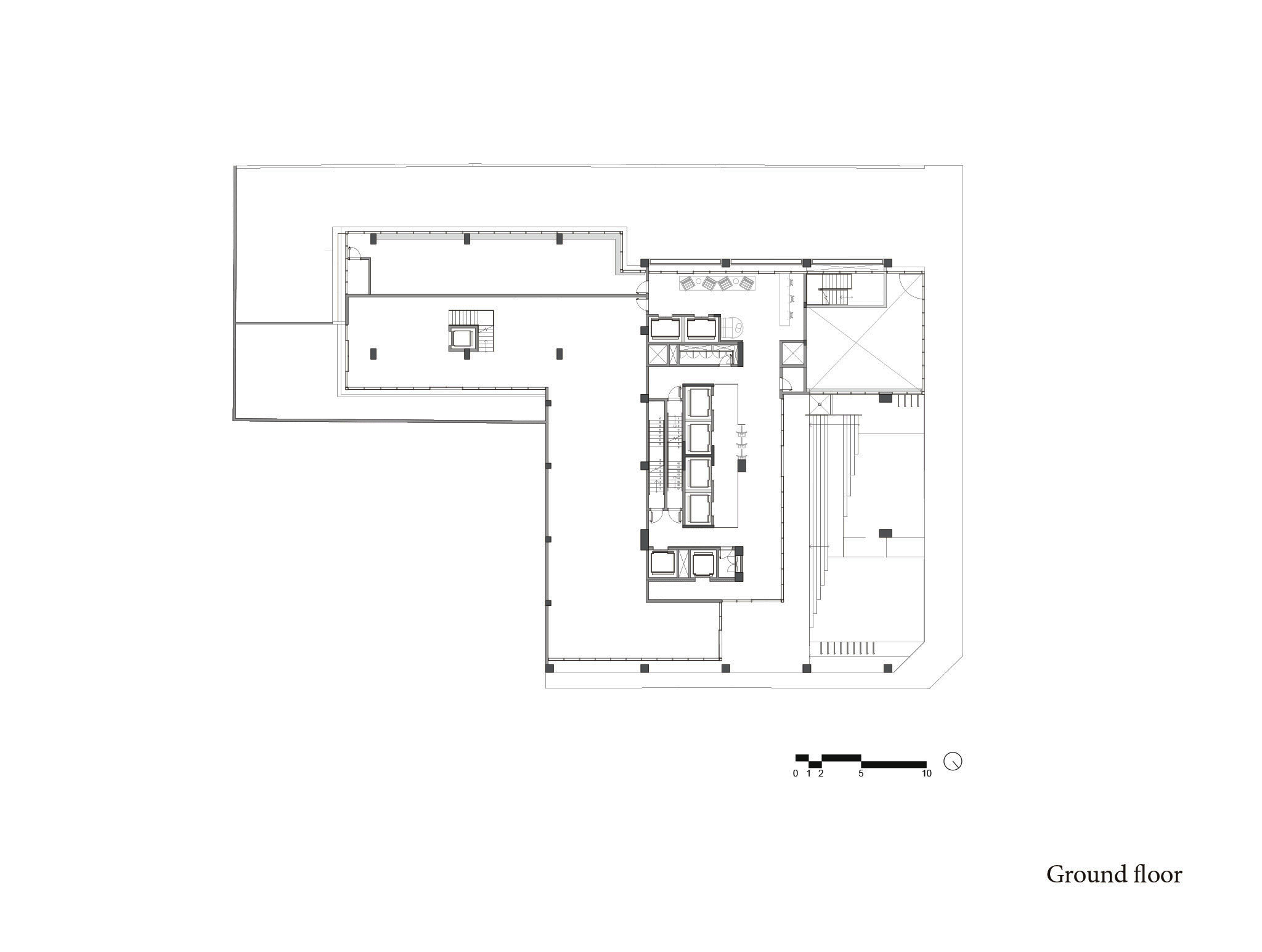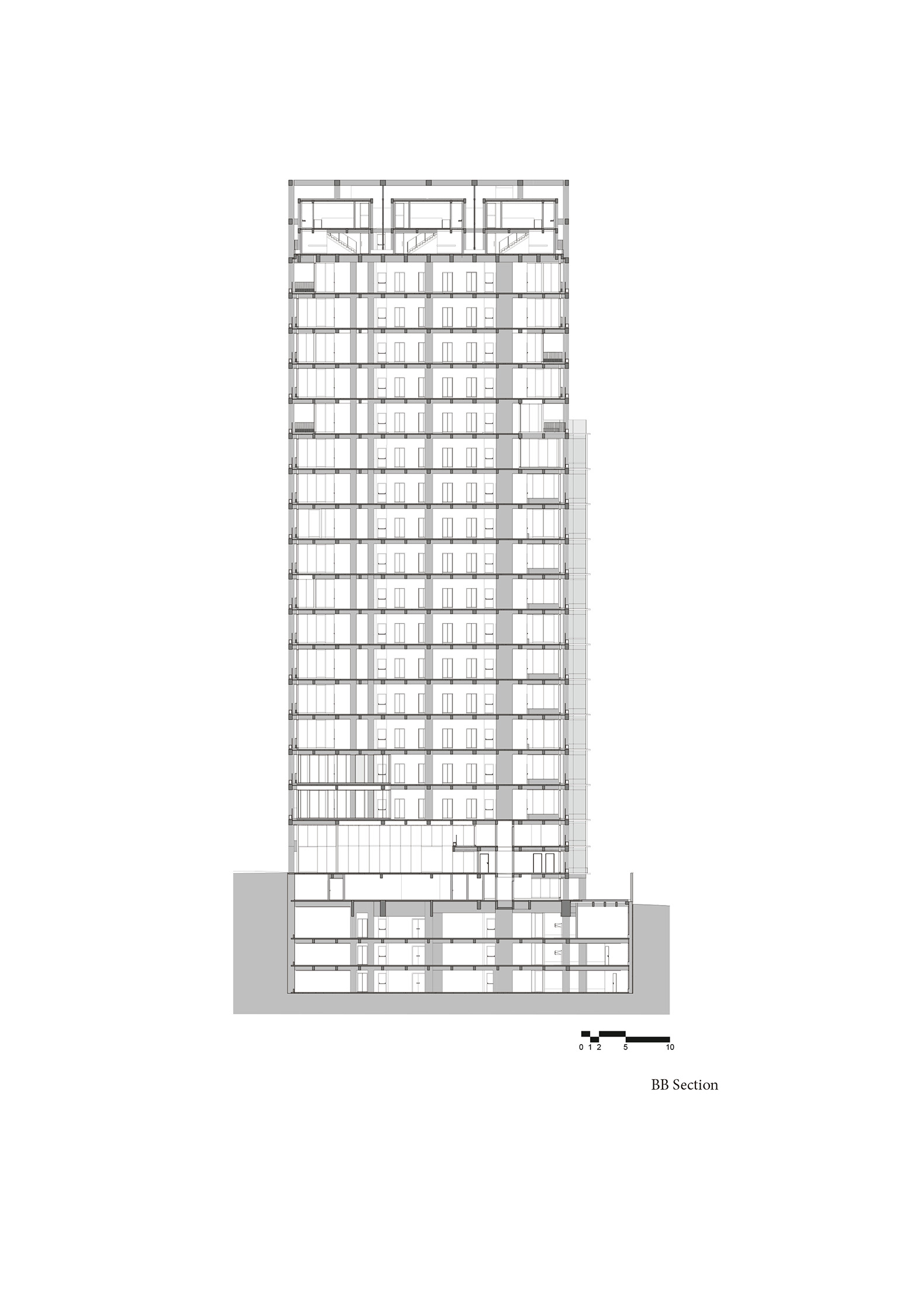 El edificio establece una delicada relación con el suelo y el cielo, entendidos como los extremos diluidos de su sistema constructivo. En la planta baja, la torre se abre a la ciudad a través de una tribuna pública y un exuberante jardín, disolviendo la frontera entre el edificio y el espacio urbano.