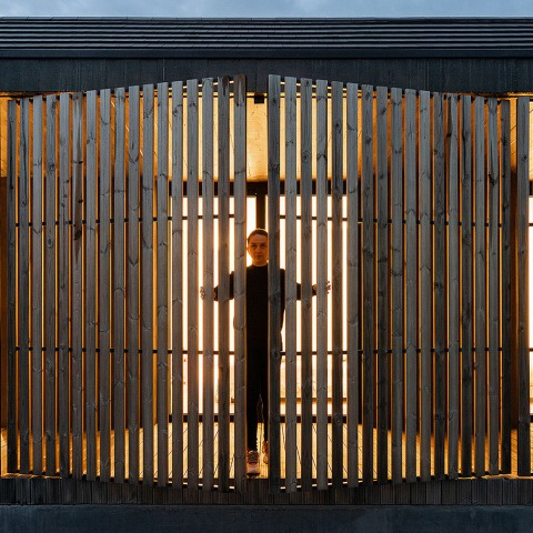 La sala de estar se extiende hacia afuera a través de una terraza, con la intención de amplificar la relación entre la casa y la naturaleza. Además, en los exteriores se utilizan el hormigón en bruto para las fachadas y largos paneles de madera, que proporcionan privacidad cuando están cerrados, pero también en conjunto generan una intervención contemporánea.