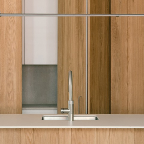El gran espacio formado por cocina y salón se utiliza de forma flexible y acoge uno de los elementos más característicos de la vivienda: la imponente isla de madera. Se emplea una materialidad expresiva y atrevida. La expresividad de la madera de roble caracteriza la imagen de esta vivienda, donde grandes listones verticales definen la cocina. La textura empleada predomina sobre el resto de la paleta de materiales. Los tonos sutiles y calmados otorgan uniformidad a las estancias. Se apuesta por soluciones cuidadas en todos los paramentos, con paredes revestidas de mortero fino.