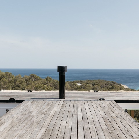 Ubicada en lo alto de una ladera, rodeada de pinos y ullastres menorquines, esta casa ofrece unas vistas privilegiadas del Mediterráneo. La belleza del lugar invitó a crear una configuración fuera de lo convencional, con recorridos exteriores y pasarelas de acceso, que potencian el contacto de la casa con su entorno.