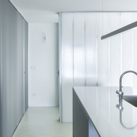Tres planos verticales autónomos, cada una resuelto con un tipo de material diferente, ordenan el espacio: un tabique de DM barnizado separa la habitación principal de la zona de estar. El ámbito de la cocina queda separado de los dormitorios secundarios gracias una partición de chapa de aluminio minionda. Un plano construido a partir de piezas de u-glass, con aislamiento de fibra de vidrio en su interior, limita el espacio del baño, facilitando la entrada de luz y generando, a su vez, un colchón térmico al oeste.