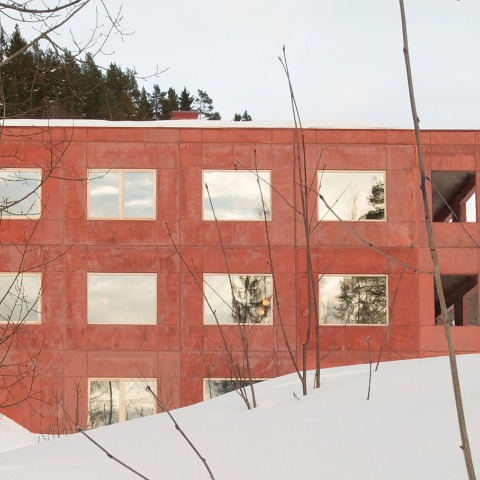 Basado en el presupuesto limitado y con dos fachadas parcialmente subterráneas, elegimos como material de construcción exterior elementos de hormigón prefabricados. Todas las fachadas, tanto superficiales como subterráneas, están hechas de hormigón aislado (Cellcrete) con una capa exterior de 50 mm en hormigón pigmentado. El óxido de hierro se agrega a la mezcla de hormigón para crear el color rojo distintivo. Las losas están expuestas en el techo para que la estructura sea legible.