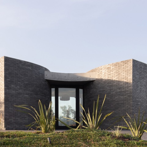 Un lote en esquina para una vivienda unifamiliar en una sola planta. Dos volúmenes de ladrillo gris curvan sus muros al llegar a la esquina para generar el ingreso.
