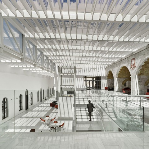 Este espacio se convierte de esta forma en la idea principal del proyecto. Cubierto con una estructura metálica , equipada con brisoleis, que apenas toca los edificios existentes se obtiene un impluvium de luz natural, cambiante a lo largo del día que permite la relación entre los usuarios ,visitantes y personal docente del edificio. Este intercambio resulta más formal en el ground level y más relajado en el basement leve, (en parte por su proximidad al university refectory) si bien ambas se encuentran comunicadas en mediante el teatro central.