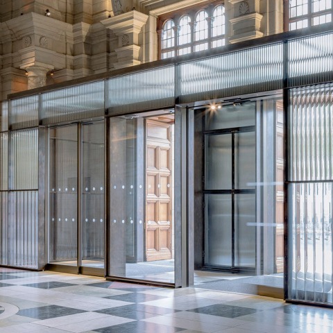 El nuevo vestíbulo de entrada está formado por tres bandas de tubos de vidrio dispuestas con tubos de 120 mm de diámetro en el nivel inferior, que luego se reducen a la mitad a 60 y luego a 30 en los niveles medio y superior. El vidrio produce distorsiones ópticas que acentúan el movimiento de las personas a su paso por la entrada. También captura y proyecta la luz del día en el museo, con toda la estructura ayudando a iluminar el interior. El vidrio aquí se usa por la forma en que transmite la luz. Asiente con la cabeza hacia las formas propias del museo de categorizar el diseño, aquí haciendo eco de los efectos que podría ver en la colección de vidrio. Los nuevos juegos de puertas correderas simplifican el acto de entrar al museo y ayudan a mejorar el desempeño ambiental del museo.
