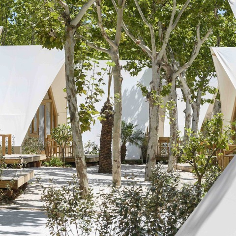 Ha sido un proyecto largo, con una pandemia entre medias, pero el resultado ha merecido la pena, se ha conseguido que los huéspedes duerman en un jardín, donde impera lo orgánico, un proyecto que revoluciona completamente el sector del camping ya que contamos con todas las comodidades de un hotel. El proyecto de arquitectura ha tenido todas las escalas, desde la más amplia y urbana que abarca desde cómo se posan los alojamientos, a los espacios que se generan, plazas, jardines, caminos, aparcamientos, la escala intermedia de unas edificaciones que albergan la recepción, un restaurante, gimnasio y demás programa necesario, las piscinas… Y una escala más en detalle, como el diseño de las tiendas de campaña, las jardineras, las baldosas de los caminos… Ha sido muy bonito vernos en un mismo proyecto trabajando en tantas escalas diferentes. La parcela es de casi 4 hectáreas y hemos intervenido en toda ella, respetando el arbolado existente de plátanos de sombra y acacias salignas y hemos potenciando dos zonas ataluzadas de gran pendiente, construyendo plataformas ligeras con terraza para allí poder instalar mobilhomes que tengan dominantes vistas al mar.
