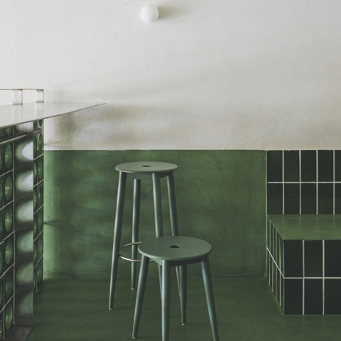 En primer lugar, una gran barra revestida de cerámica funciona como elemento de bienvenida y combina la exposición de producto con la preparación del mismo. Seguidamente, se levanta un anfiteatro que recibe una doble función: sirve de graderío para los comensales, y resuelve el desnivel por medio de una escalera integrada. Por último, en la zona más elevada se coloca el comedor, una sala rodeada de bancadas y flanqueada por vegetación. El color de estas plantas se mezcla con el resto de tonos verdes, en un claro deseo por construir una identidad que caracterice la filosofía de esta nueva marca.
