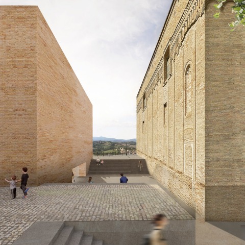 Está ambiciosa propuesta de espacios contempla reducir significativamente la nueva volumetría prevista en el programa, mediante la decisión de localizar la parte menos representativa y pública dentro de un basamento funcional, en el zócalo histórico existente – la parte residual de las murallas de la ciudad – bajo el nivel de la plaza del Convento. De esta forma se consigue un doble objetivo: por una parte se concentran las funciones públicas, protocolarias y culturales en torno a la escalera monumental del Panfili, y por otra se propone ahora una gran terraza panorámica, con una vista de 360º ante el espléndido paisaje circundante, al situarse en el punto más elevado de Montegiorgio, donde antes estuvo el convento de San Francisco.