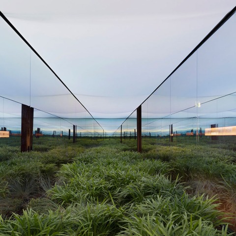 Vértigo horizontal se configura mediante efectos combinados. Por un lado, la ruptura de las nociones ambientales de contenedor/contenido, mediante un gesto de confinar la totalidad del horizonte en una caja de vidrio, desafiando así la lógica perceptiva, a modo de iteración arquitectónica que remite a innumerables relatos borgianos. Por otro lado, la osada empresa de reconstruir lo inabarcable en la virtualidad de los reflejos y las transparencias: la fragmentación caleidoscópica de los cielos y la repetición geométrica de la vegetación delata la artificialidad del gesto de transportar el territorio, desarticulando la mímesis pero inaugurando a la vez nuevas experiencias del espacio.